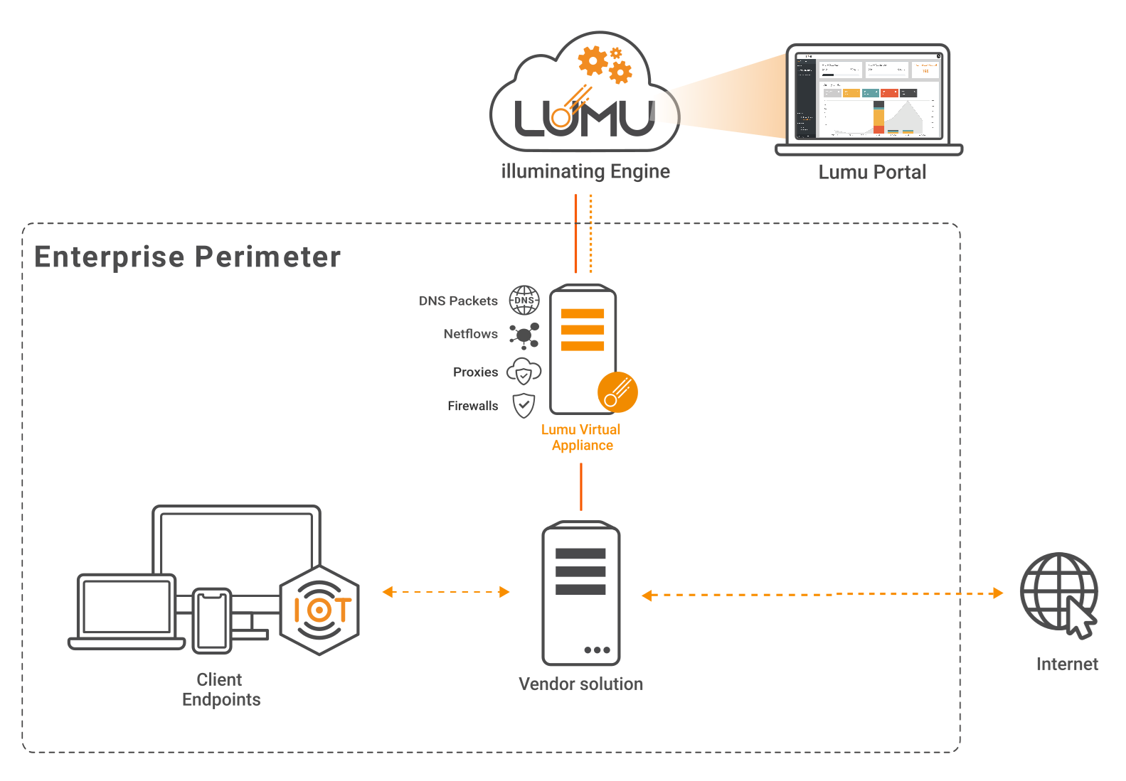 The Lumu Virtual Appliance (VA) is a pre-configured lightweight virtual machine solution that collects the network metadata of your entire enterprise and forwards it to the Lumu cloud with the lowest impact on the network operation.