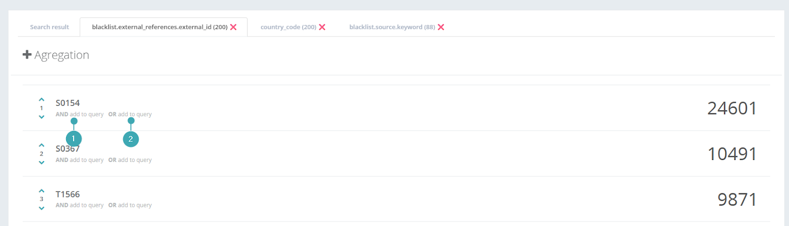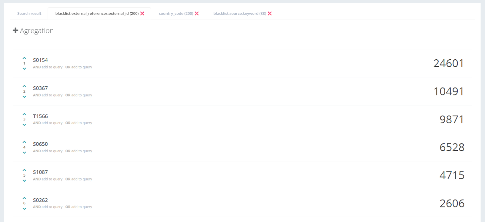 5. Go into the aggregation tabs, you will see the results are organized by the numbers IoCs included on each result (number of IoCs on the right).