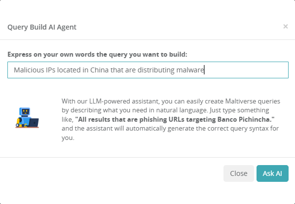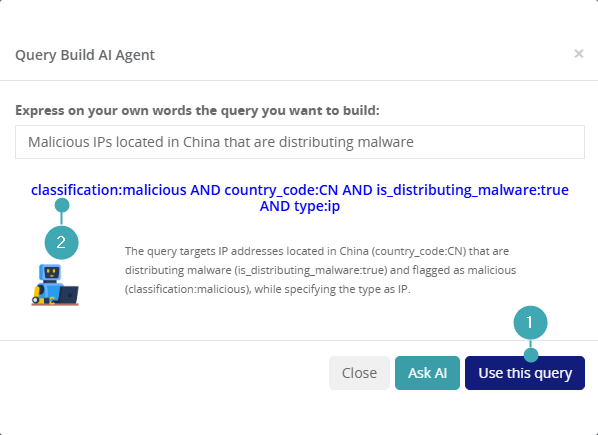 2. Now simply type your request, for example: Malicious IPs located in China that are distributing malware. Then, click Ask AI to generate the query in the correct syntax.