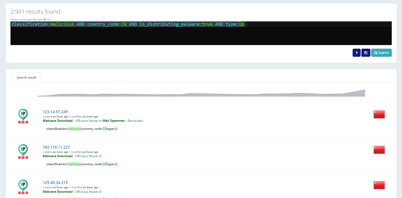 type:ip AND classification:malicious AND as_name:AS4134* AND is_distributing_malware:true