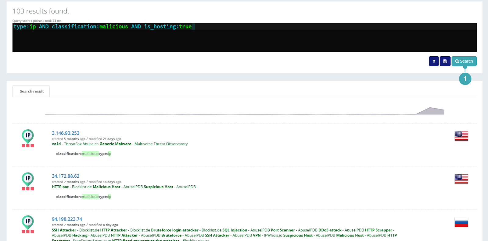 3. Click Search (1) or press Enter on your keyboard to run your search. You will see the list of filtered IoCs that match your query.