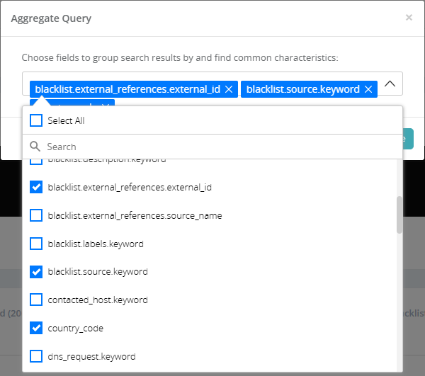 3. Select the fields you want to aggregate, you can select multiple fields at a time. Once you select the fields, simply close the Aggregate Query modal.
