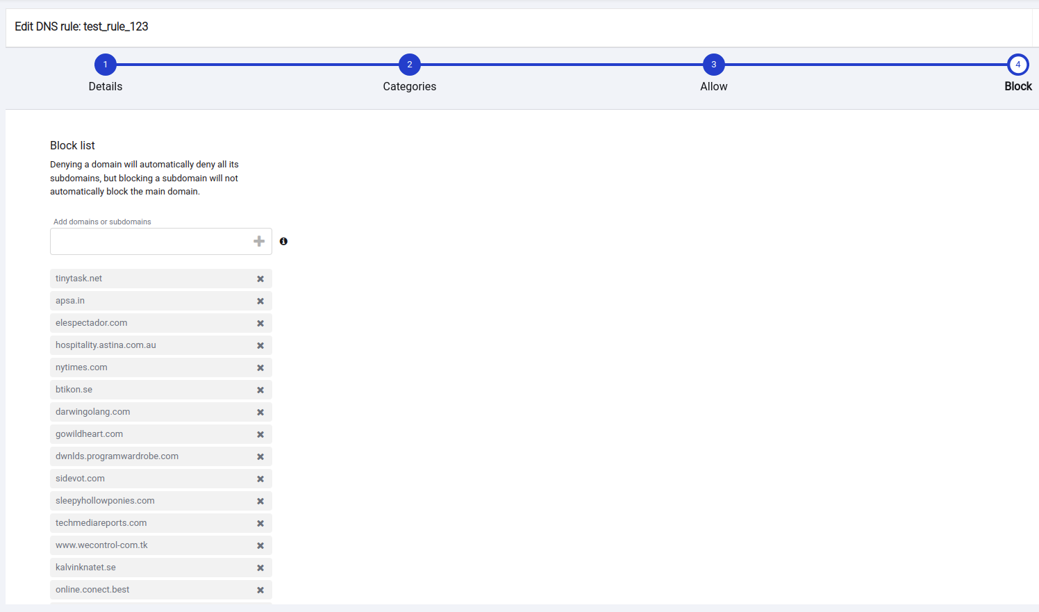 After running the integration, you can check your DNS Filtering rule block set. Go to Monitor - DNS Filtering, click the selected DNS rule on the Rules tab, and check the blocked domains.