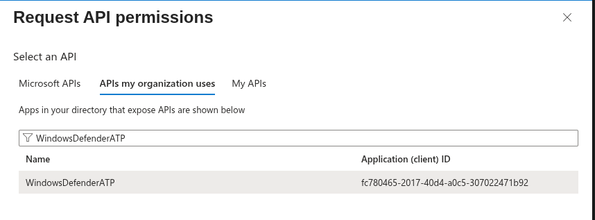 3. The Requests API permissions form will pop up. Click the APIs my organization uses tab. Type WindowsDefenderATP in the search box. Click on the result.