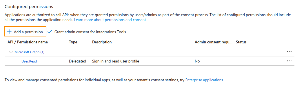 2. Click the Add a permission button in the Configured permissions section.