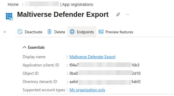 5. You will be redirected to the application overview page. Copy the Application (client) ID and Directory (tenant) ID. Keep them at hand, they will be needed later to activate the integration in the Maltiverse Portal.
