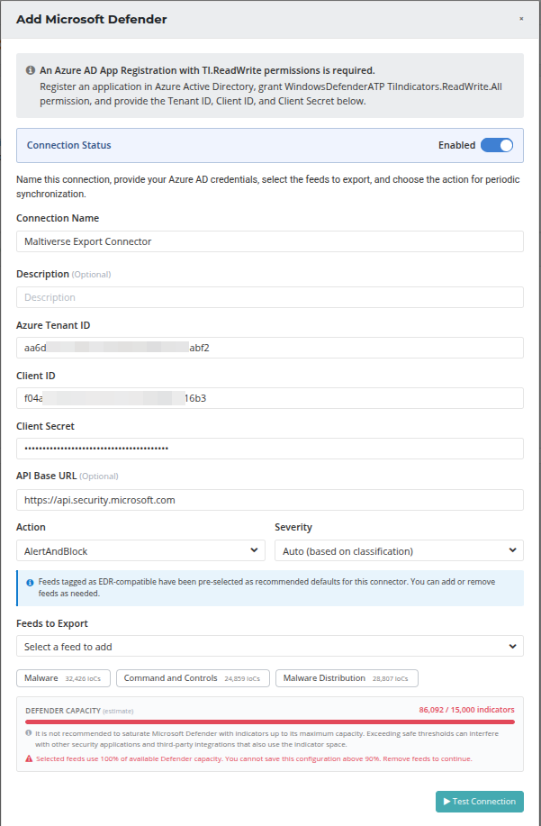 | Feeds to Export | Required | Select one or more Maltiverse feeds whose indicators will be exported to Defender. |