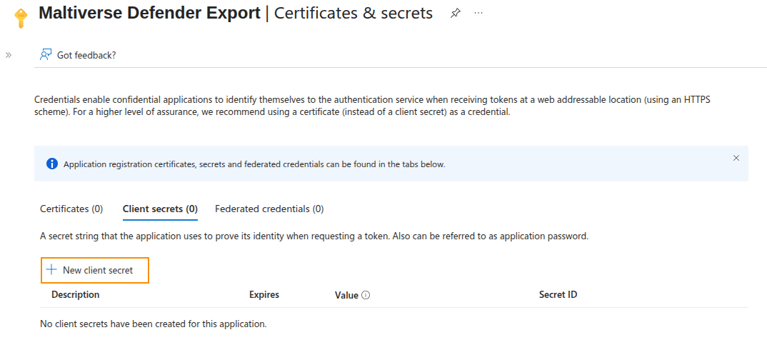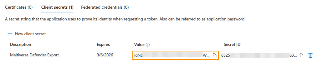 Now, you are ready to create a secret for your Maltiverse Defender Export App registration.