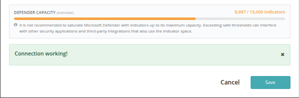 When you create or edit a connection, the system queries the Microsoft Defender API to determine how many indicators are already in use in your tenant. This provides the real remaining capacity:
