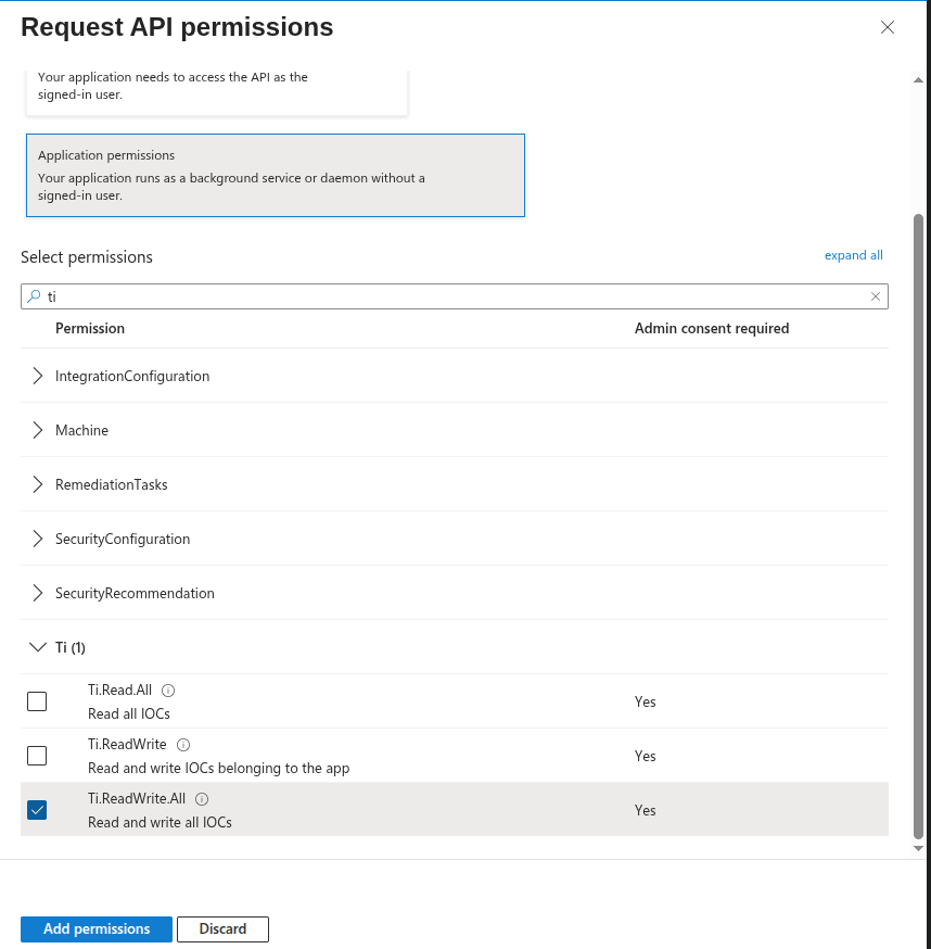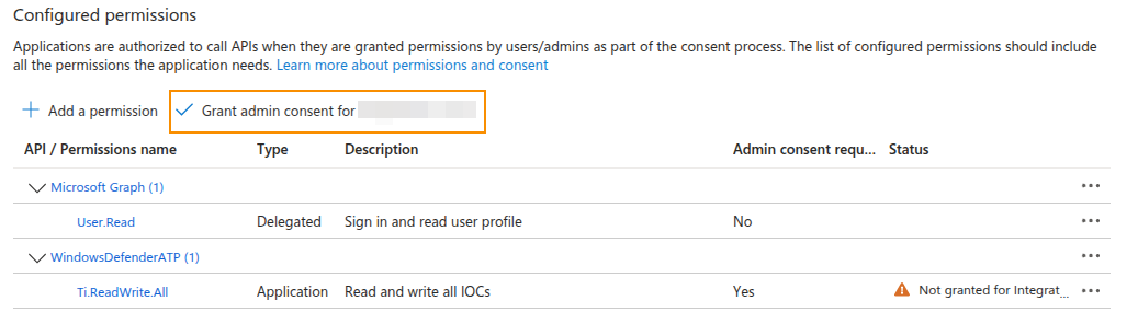 5. Click the Grant admin consent for button to grant admin consent to the newly added permission. This is needed by the connector to manage IOCs.