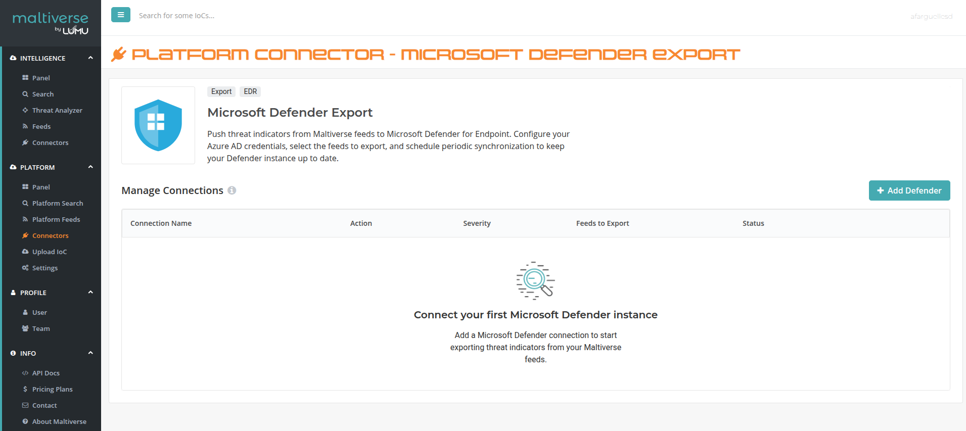 To configure the Microsoft Defender Export Connector, log in to the Maltiverse Portal and navigate to Threat Intel > Integrations > Microsoft Defender. Then, click Add Defender.