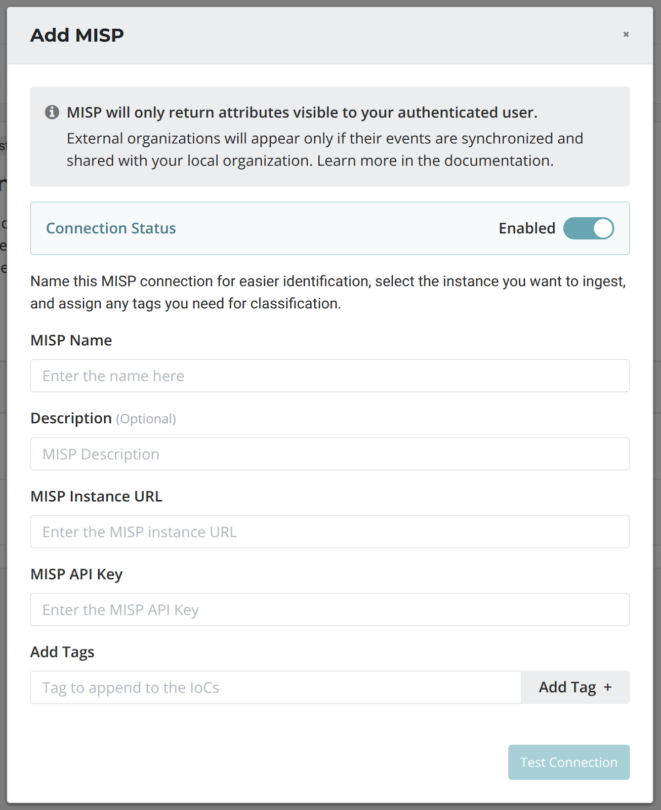 https://misp.example.com6. Once you fill up the form, click Test Connection to verify the connectivity.