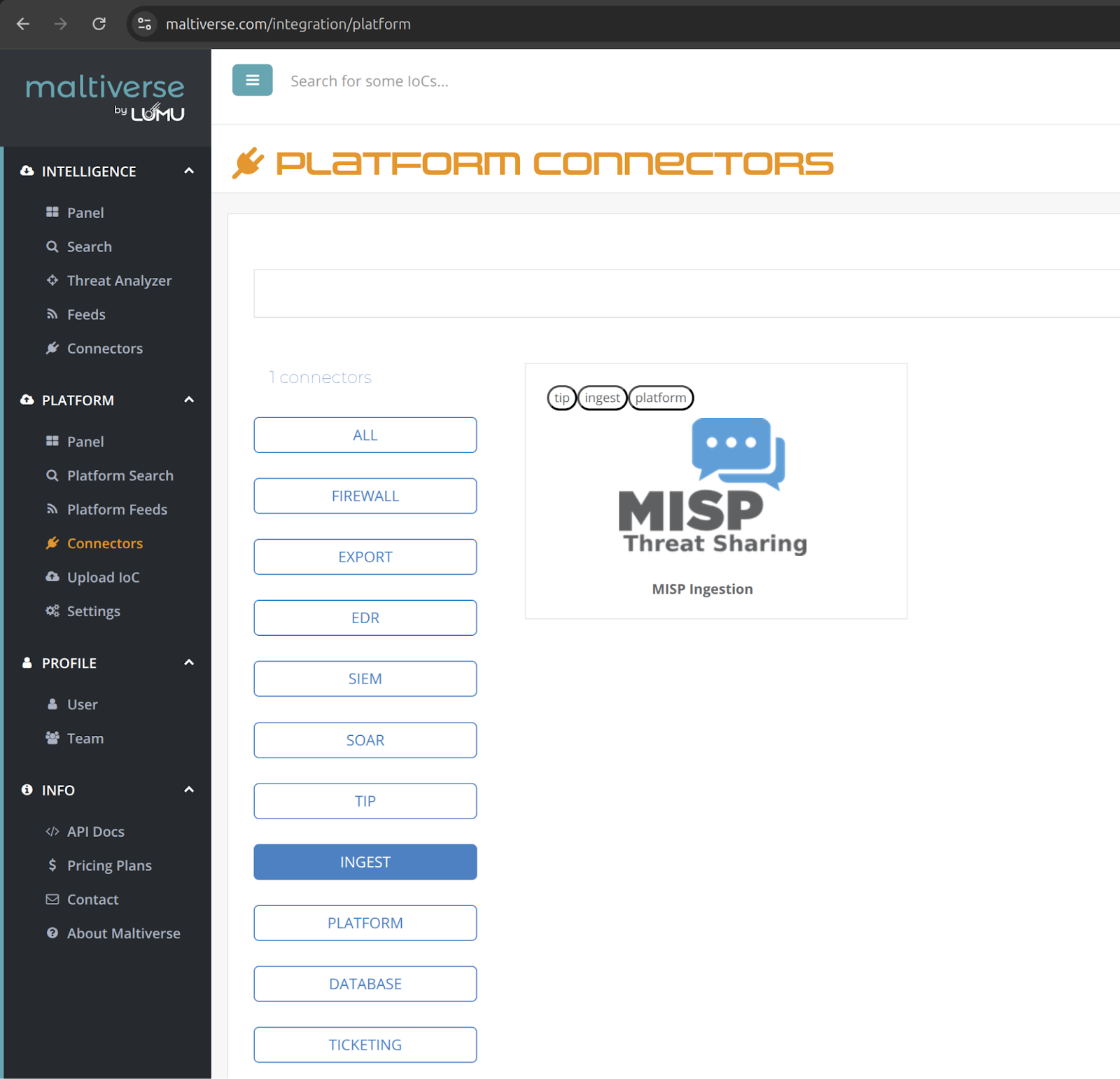 3. Filter the list by INGEST. Then, select MISP Ingestion.