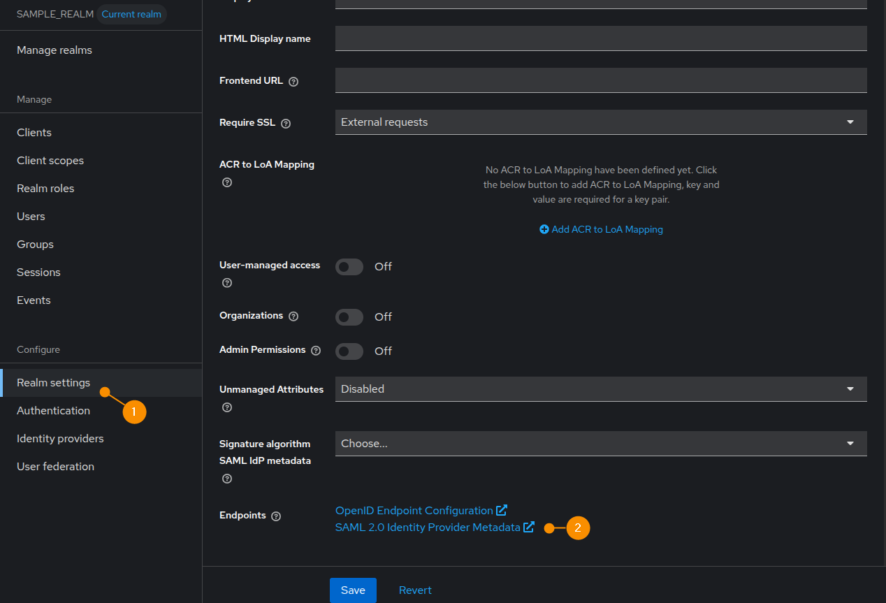 1. Access your Realm and go to Realm Settings (1). Scroll down to Endpoints, and click the SAML 2.0 Identity Provider Metadata (2).