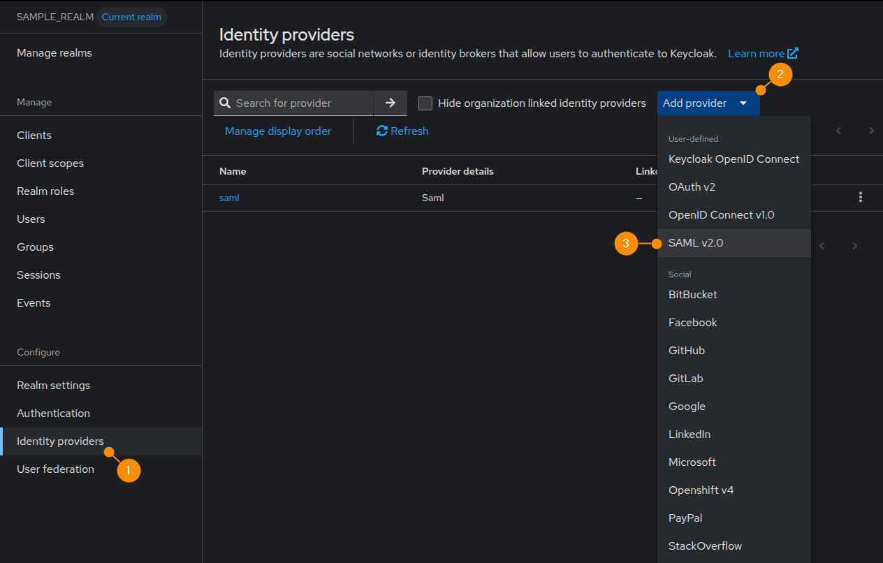 3. In the left-hand menu, navigate to Identity Providers (1). Then, expand Add provider (2), and select SAML v2.0 (3).