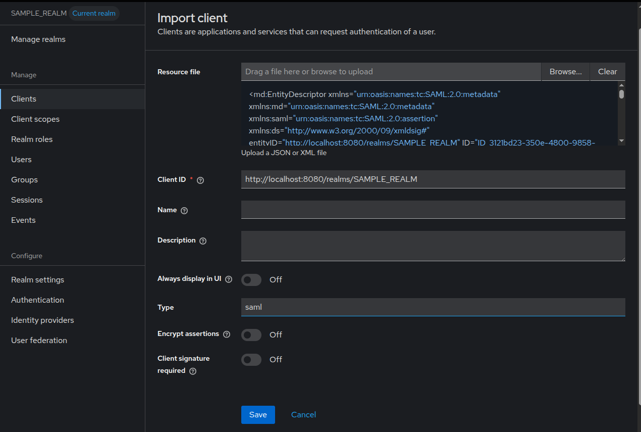 7. Upload the .xml file you downloaded in step 5 into the Resource file field. Then disable the Client signature required option, and click Save.