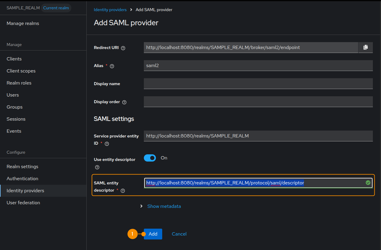 4. Paste the previously copied link into the SAML Entity Descriptor field, then click Add (1).