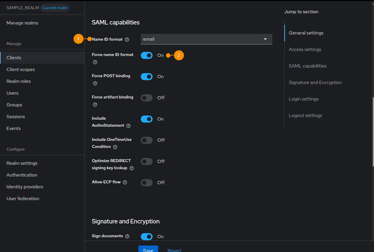 Then scroll further down, set Name ID format (1) to email, and enable Force Name ID format (2).