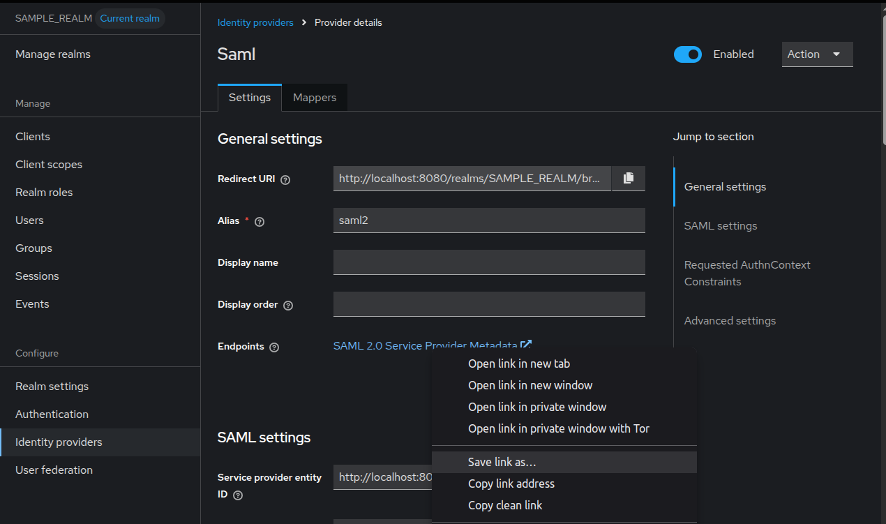 5. Open your newly created provider, and right-click the SAML 2.0 Service Provider Metadata link. Select Save link as…, and save it with an .xml extension.
