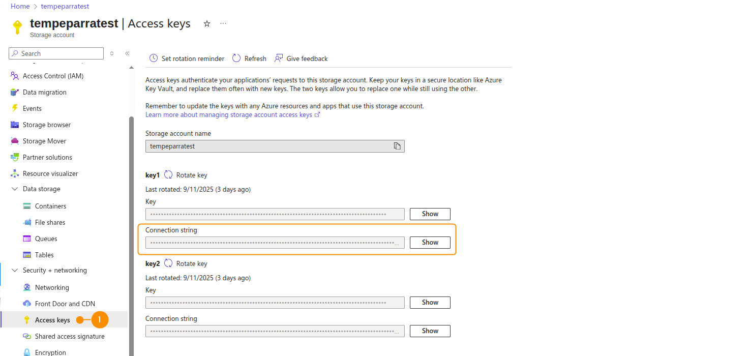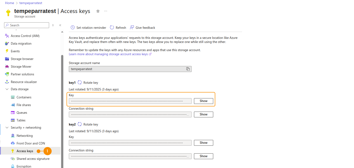 Access storage account and select Access keys (1) under Security + networking. Then copy the Key and the Storage account name. Save them for later as they will be needed for the integration.