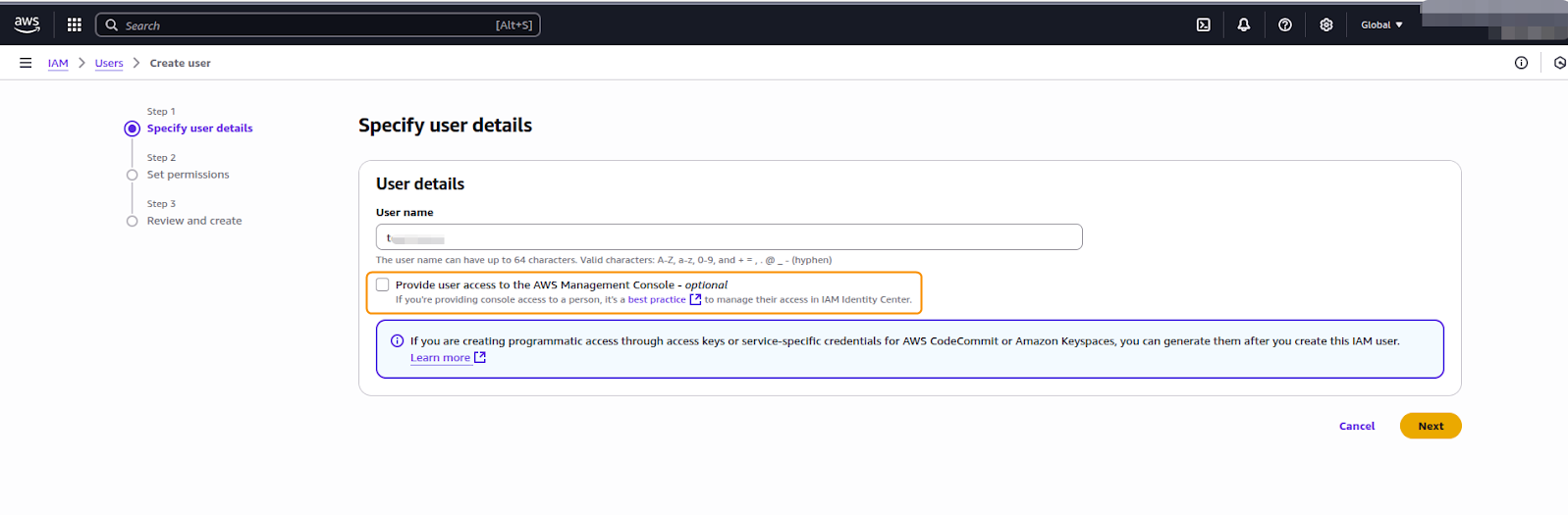 Navigate to IAM > Users and select Create User. Then, follow these steps:
