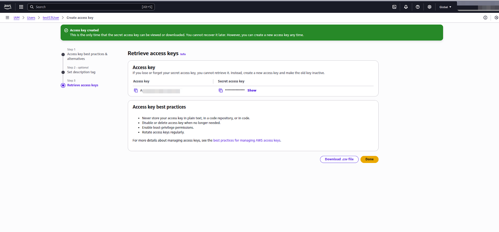 5. Copy the Access key and Secret access key. They are required as input parameters for the integration.