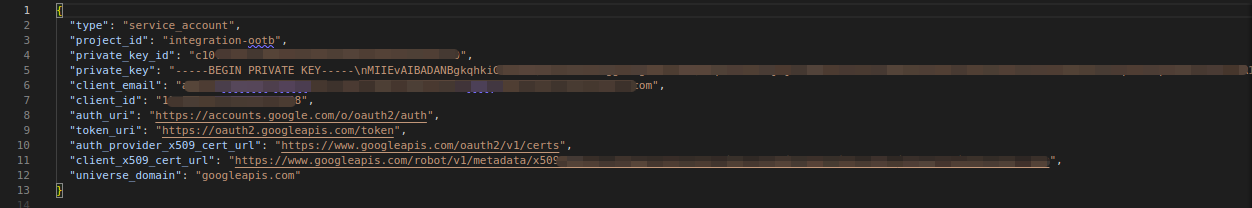 4. Once you create the new key, download it and save the path of the file for the integration. You will get a file that looks as follows: