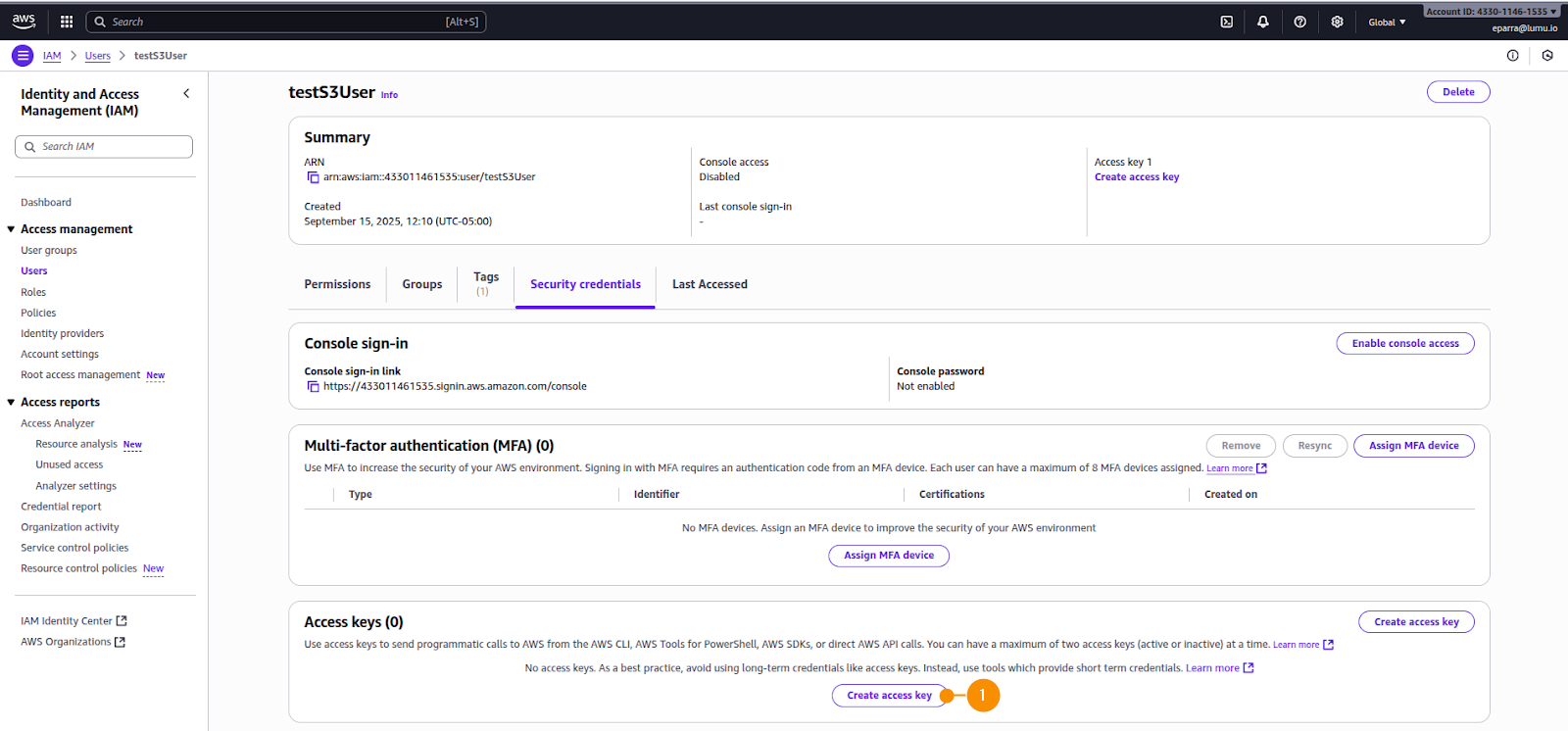 3. After creating the user, access its details and navigate to the Security credentials tab and click Create access key (1).
