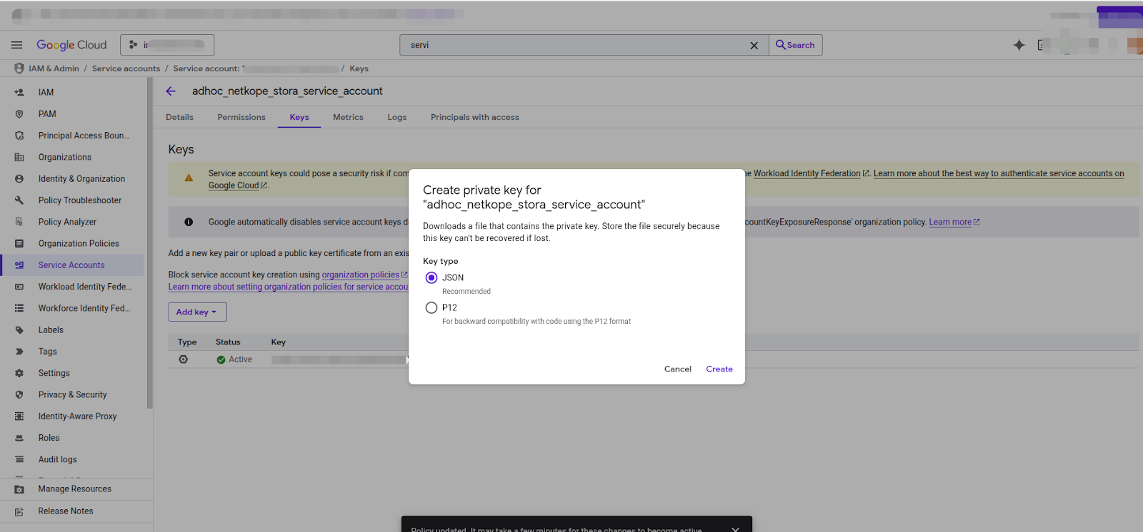 3. Enter the Service account created, navigate to the Keys tab. Then, click Add Key and select JSON format in the creation pop-up.