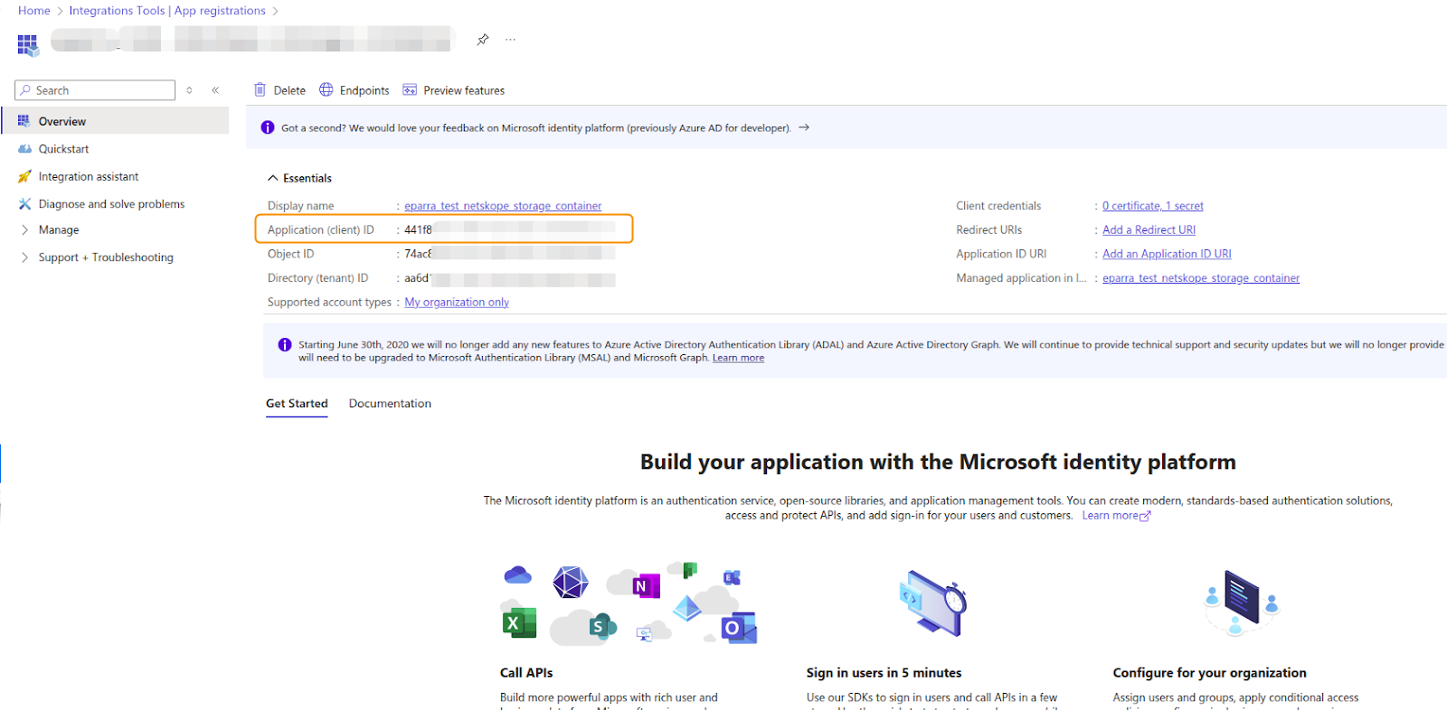 3. Go to the overview section of the new app registry, and copy the Application (client) ID. Keep it at hand as it will be required for the integration.