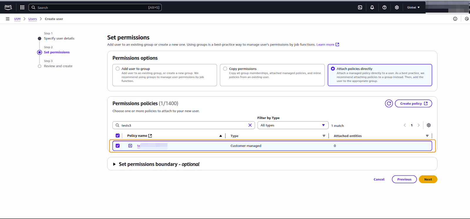 2. On Step 2, select the policy created previously. Then, click Next followed by Create in the last step.