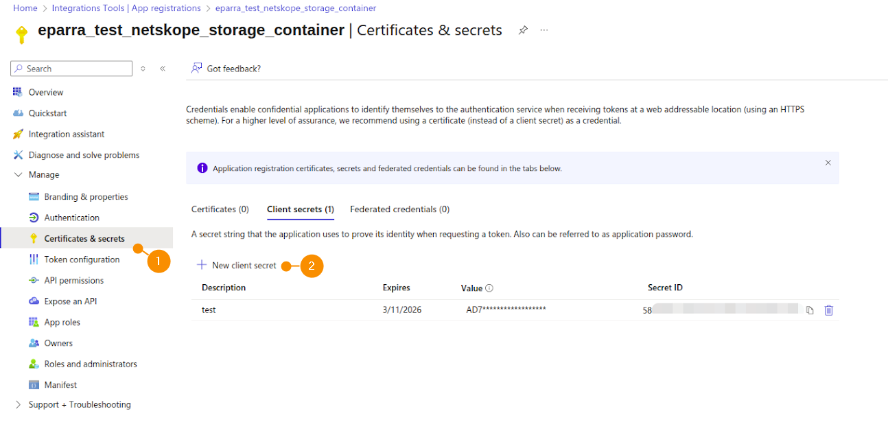 4. Now, navigate to the Manage section, and select Certificates & Secrets (1). Go to the Client Secrets tab, then click New client secret (2) and configure a name, and an expiration date to generate the client secret. Copy the Client Secret Value. This value will only be visible once, so save it for the integration.