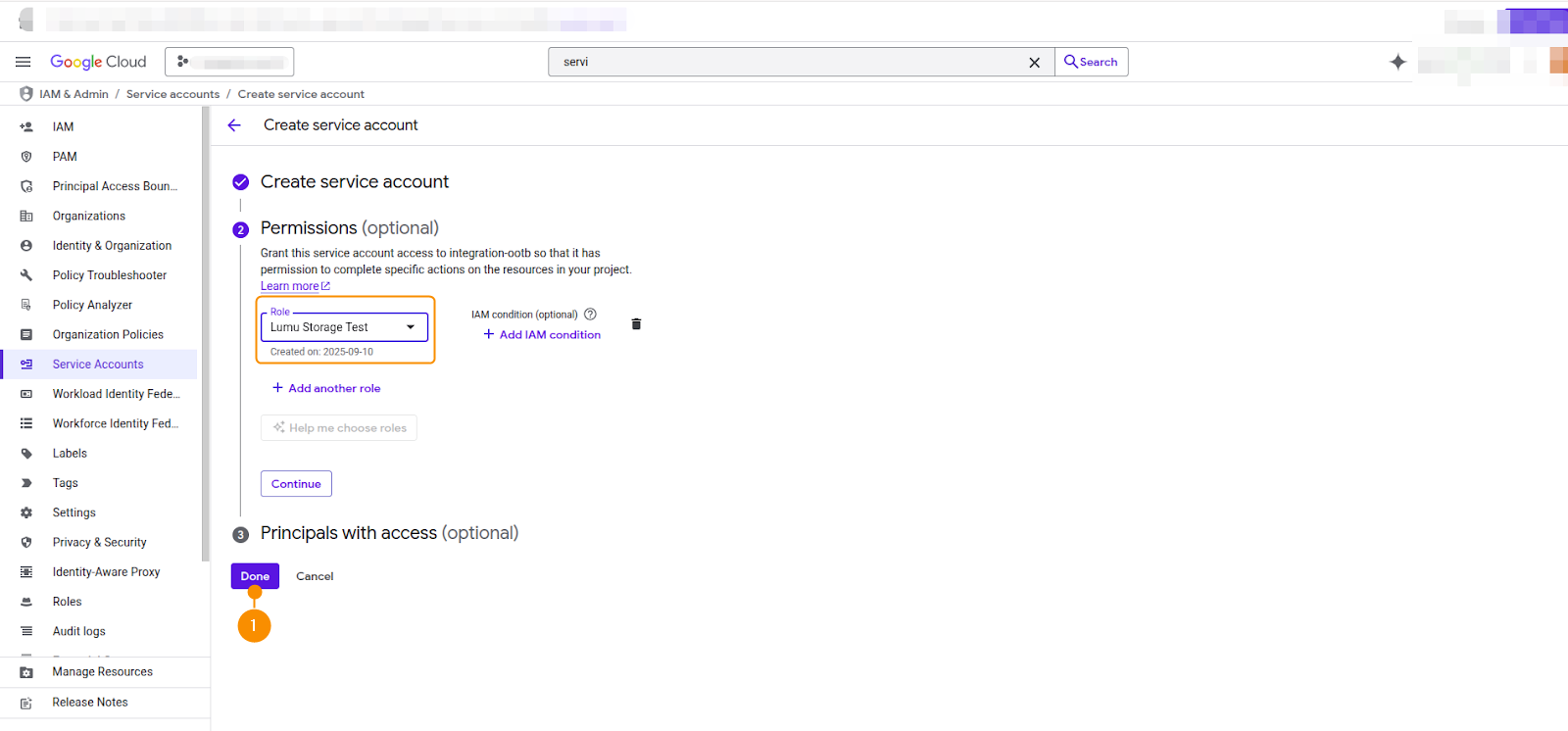 2. Then, add the role created previously for the integration and click Done (1) to create the account.