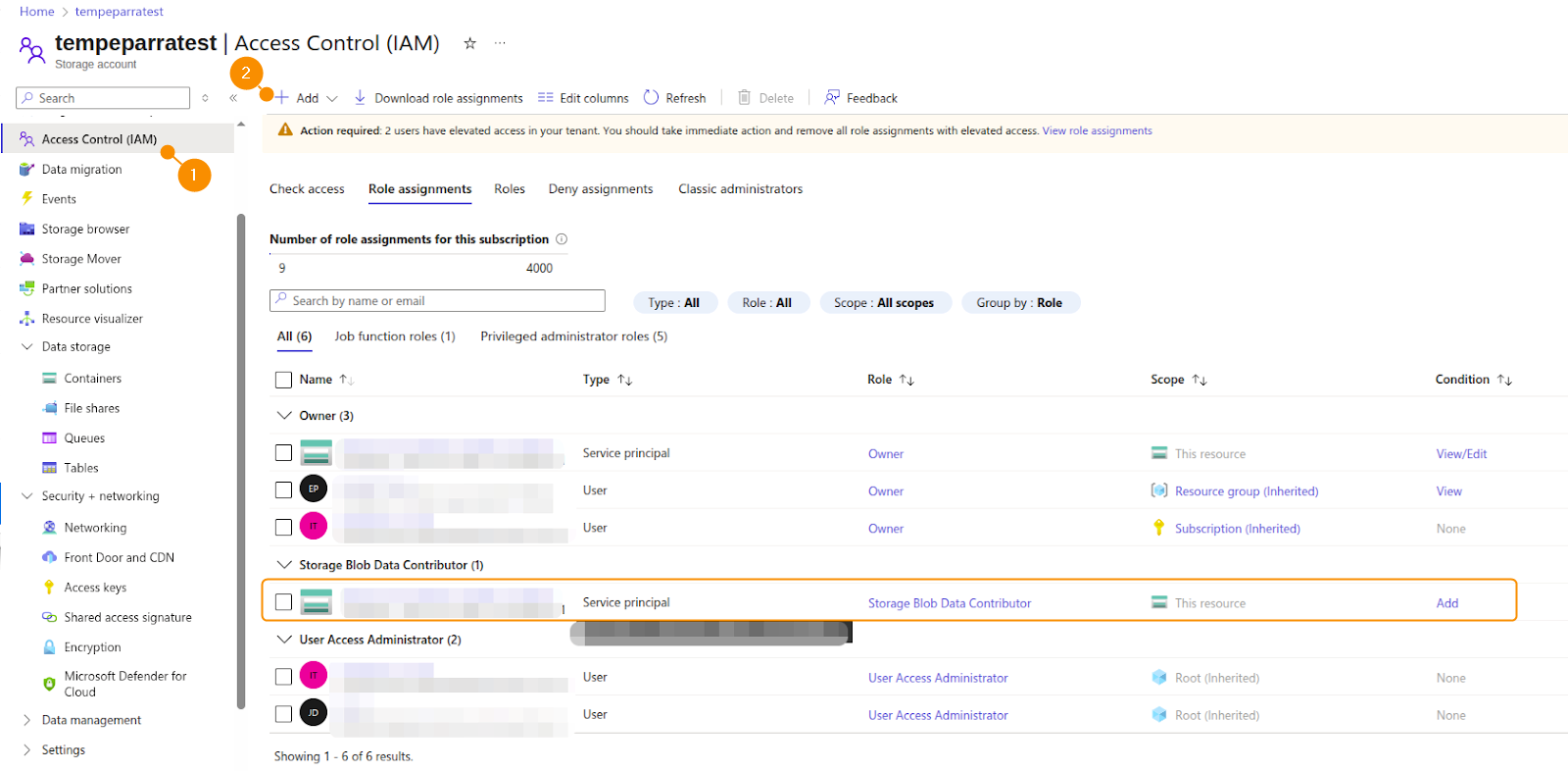 5. Now, access the Storage Account to which you will assign the Storage Blob Data Contributor Role, then select Access Control (IAM) (1). Click + Add (2) and assign the Storage Blob Data Contributor role to the previously created app as a member.