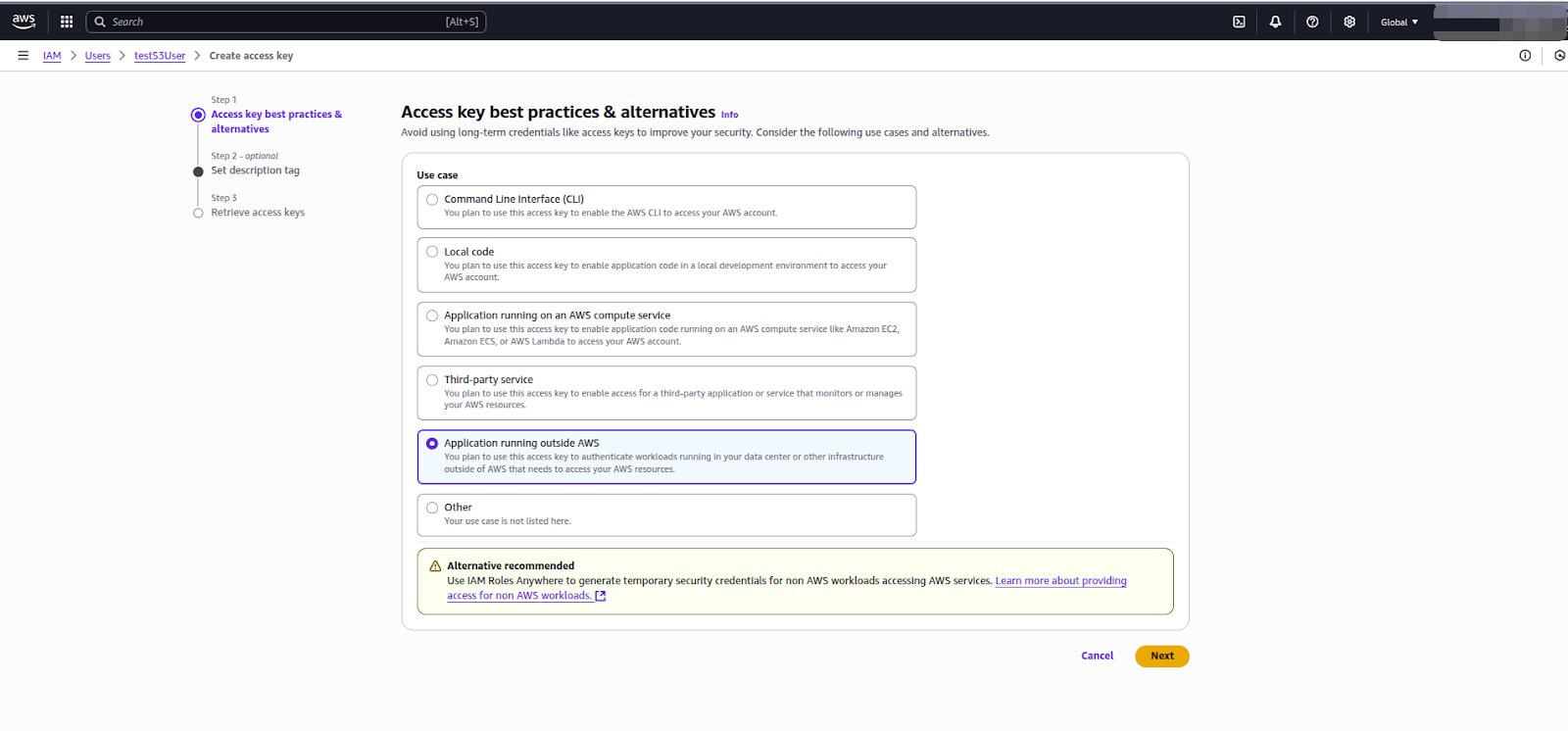 4. Select the Application running outside AWS option, then click Next.