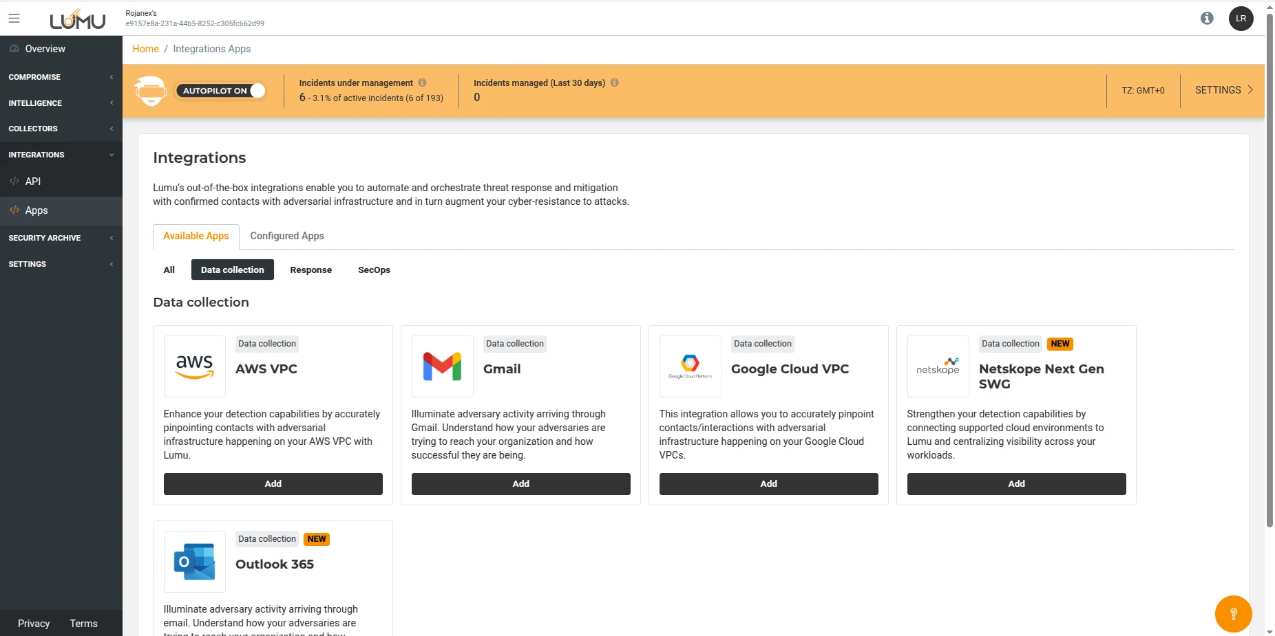 1. In the Lumu Portal, head to the left panel and select Integrations > Apps. Then, click on the Data Collection tab.