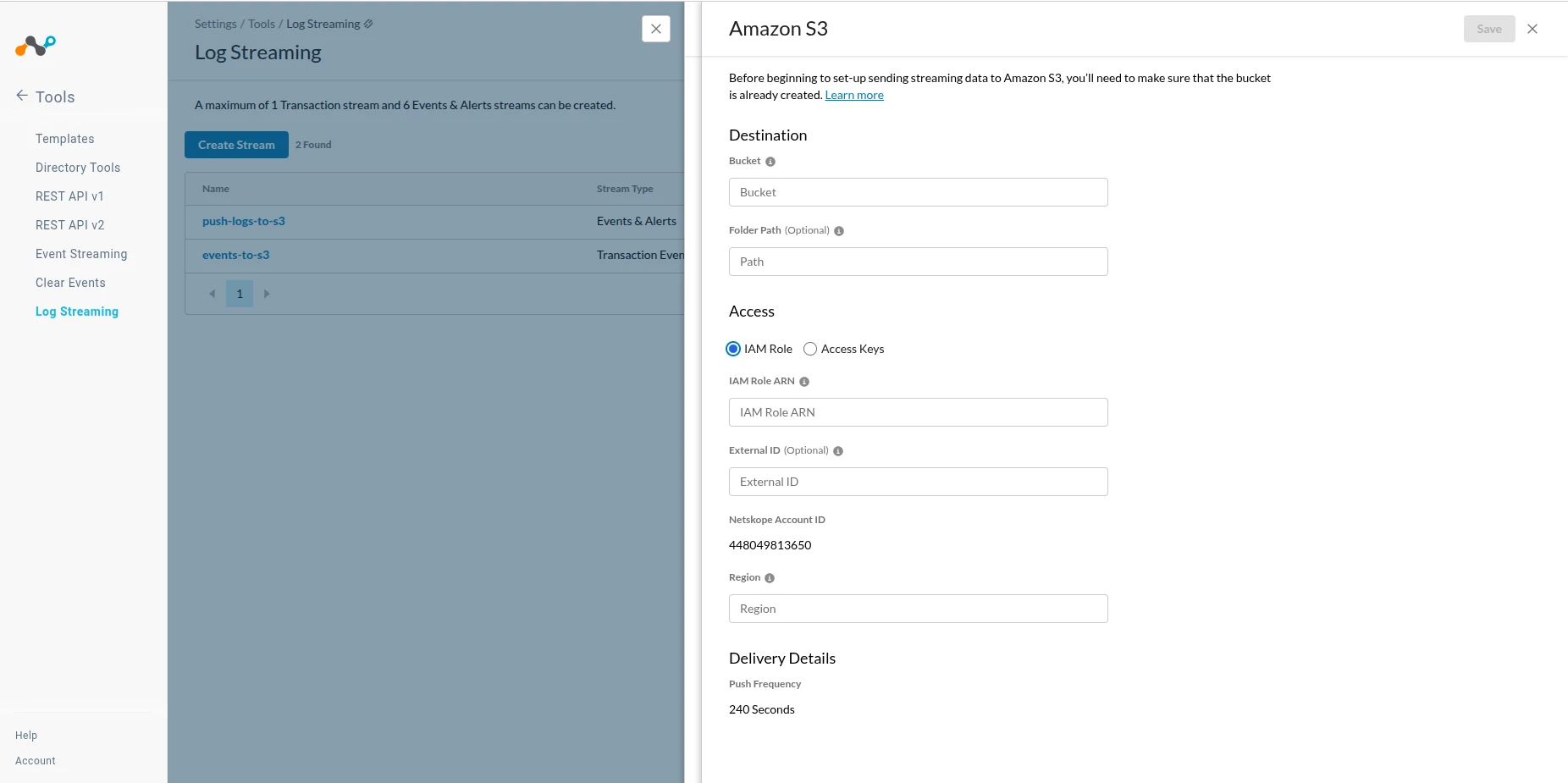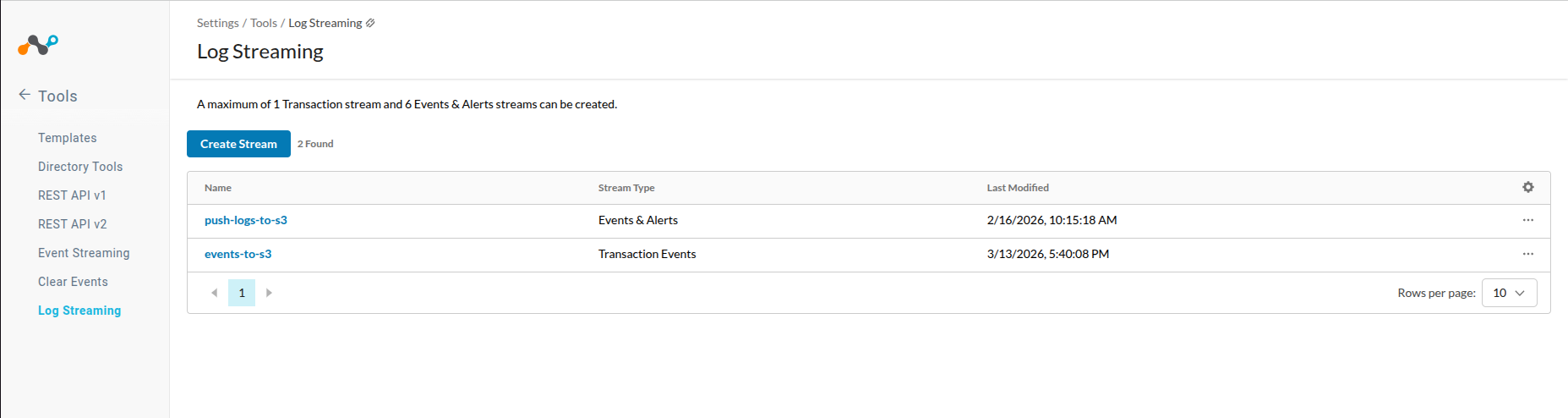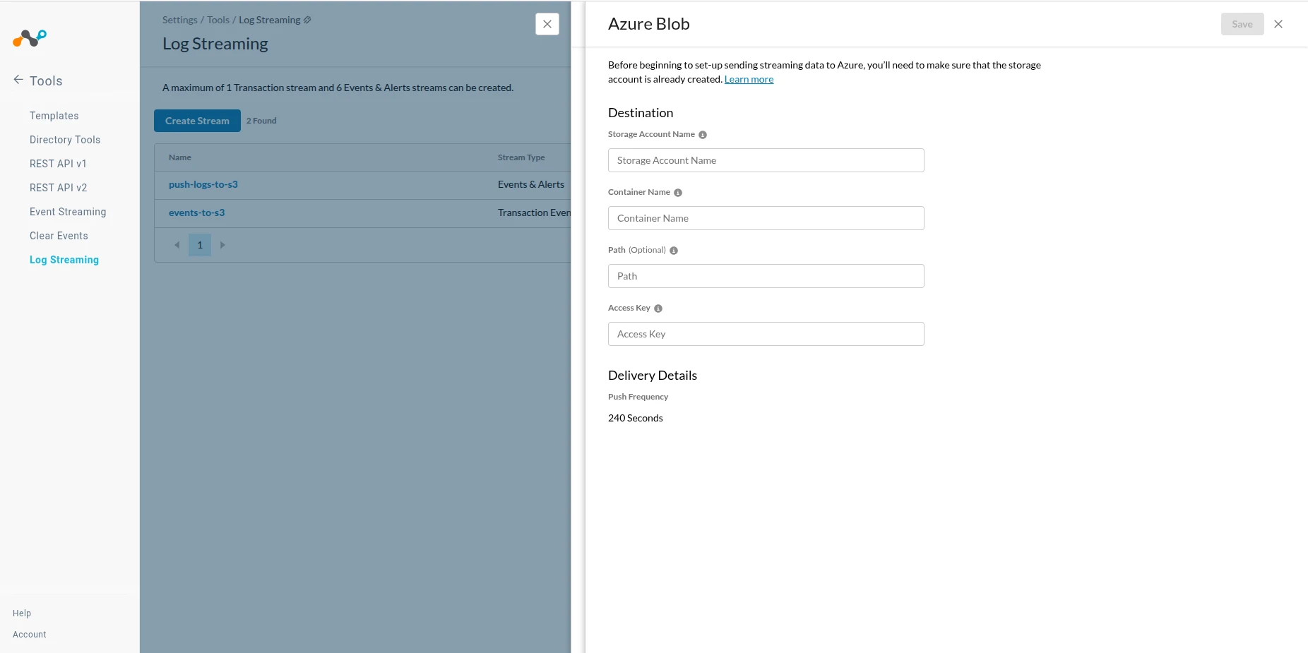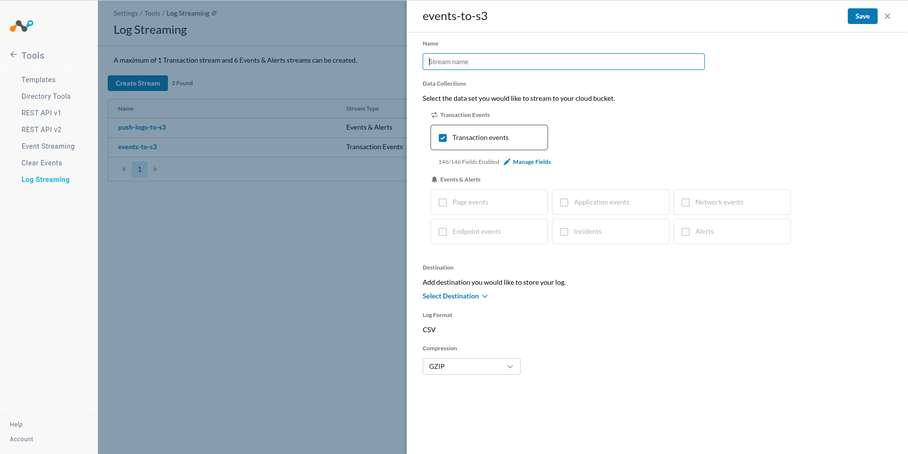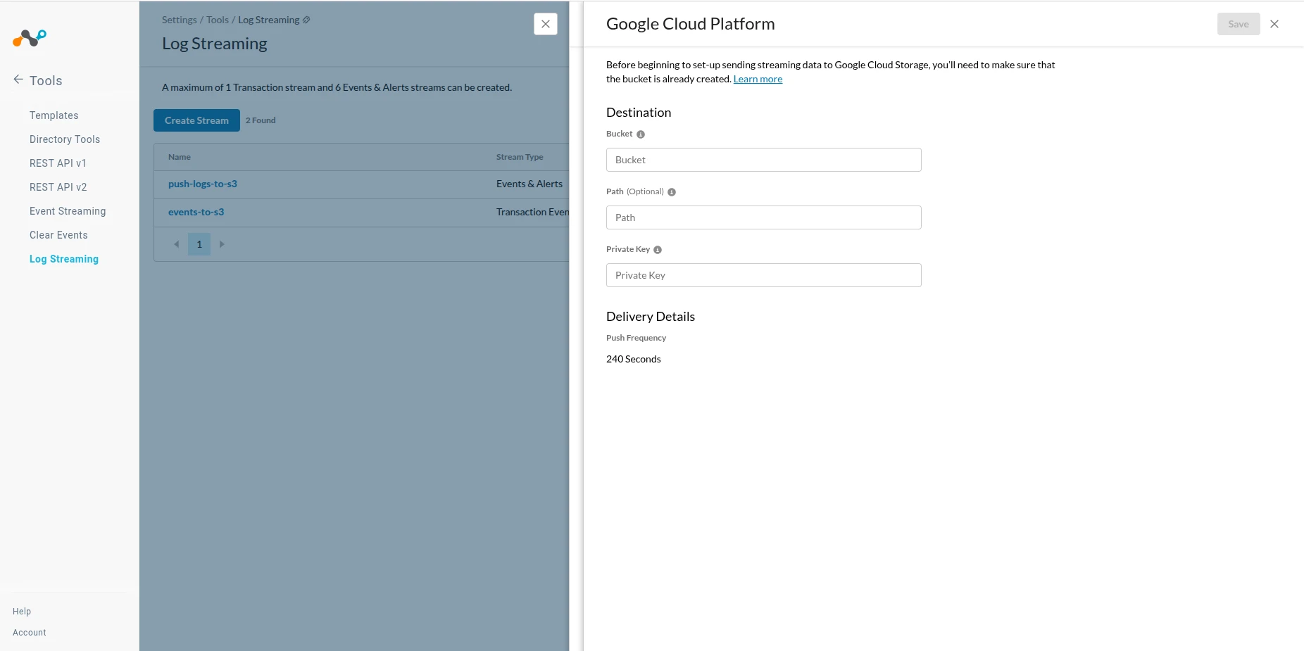 2. Navigate to Settings > Tools > Log Streaming and click on Create Stream.