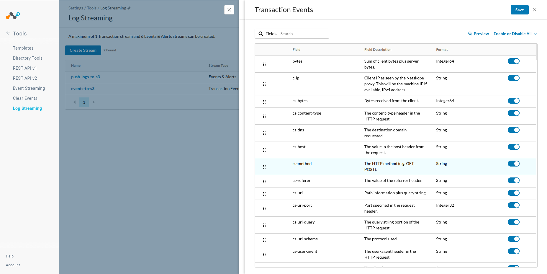 To set up the integration, you must prepare your Netskope Log Streaming instance to communicate with the Lumu integration. To do this, you need to create a transaction log streaming.