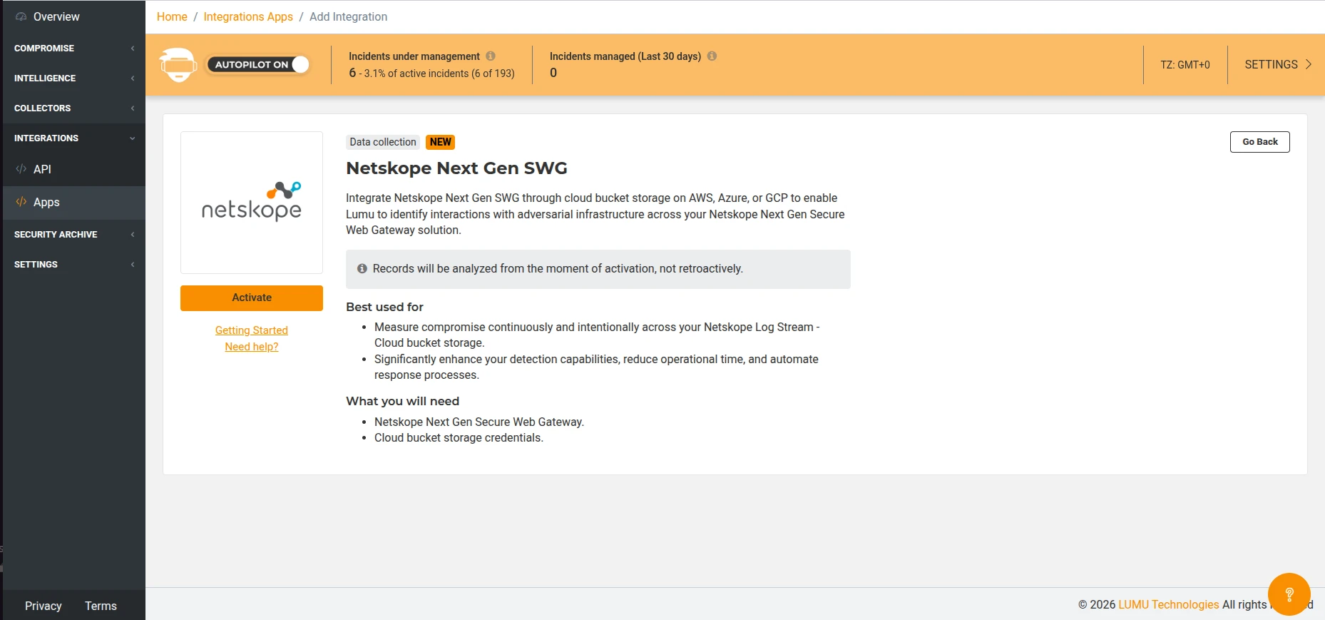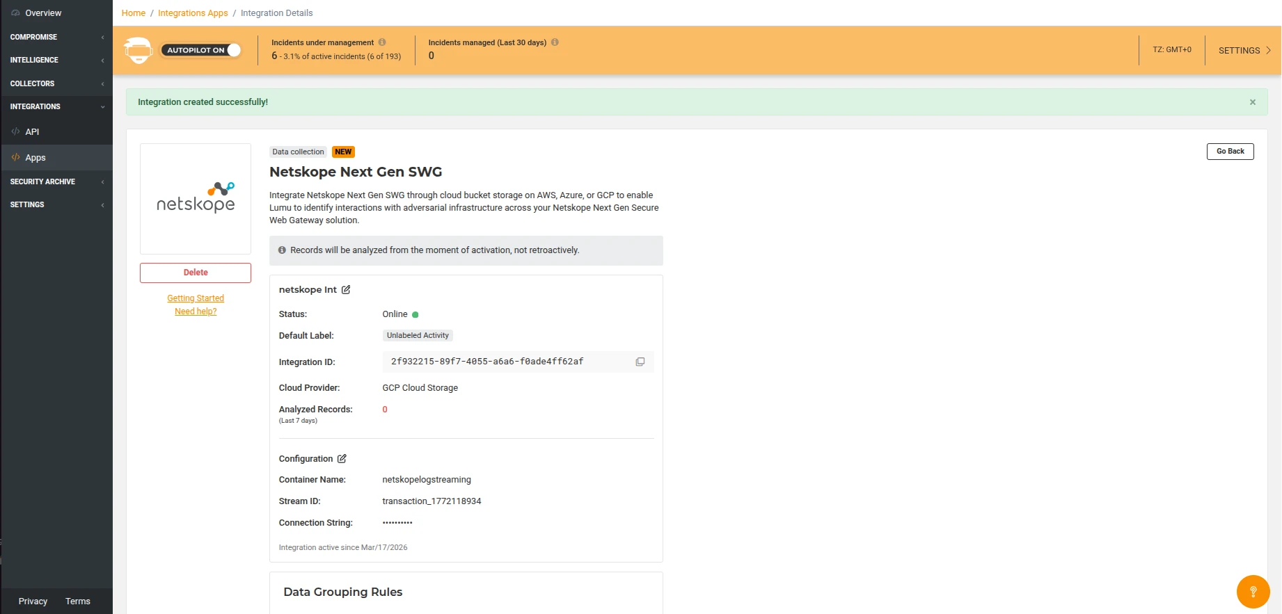 7. Once you activate the integration, the Lumu Portal will display the details of the newly created integration.