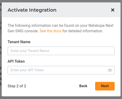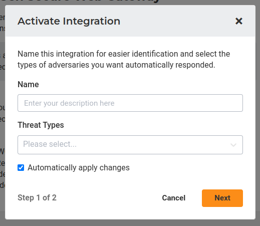 4. To activate the integration, click on the activate button, add a Name , and select the Threat Types that you want to push to your Netskope Next Gen SWG cloud. If you would prefer that Lumu activates your cloud with the new configuration, you should keep the option “Automatically apply changes“ selected. Finally, click on the Next button.