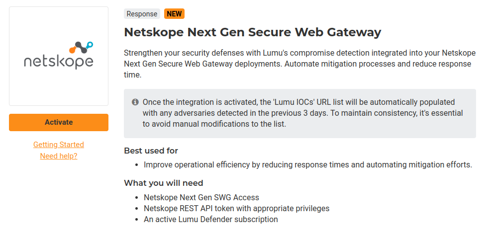 Once the integration is activated, the Netskope Next Gen SWG URL list will be updated with confirmed compromises found by Lumu within the preceding 3 days.