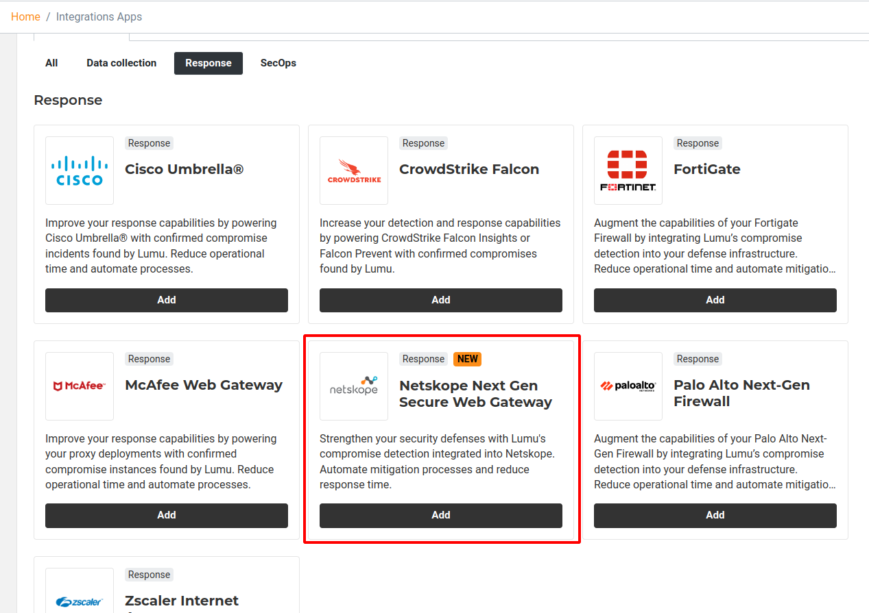 2. Locate the Netskope Next Gen SWG integration in the available apps area and click to add, then click to view details.