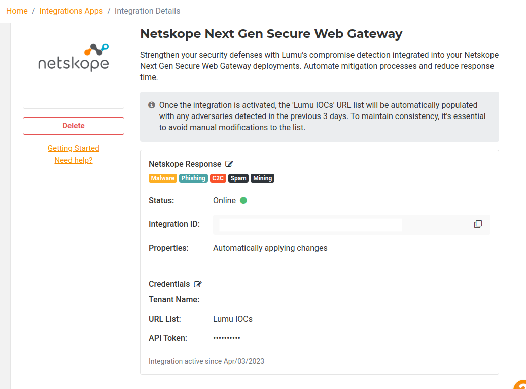 6. The integration is now created and active. Now, the Lumu Portal will display the details of the created integration: