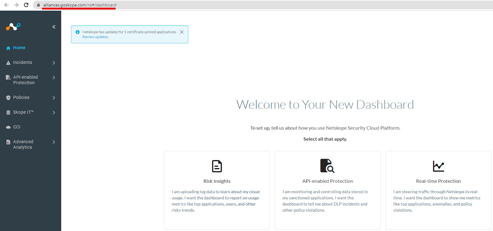 The Tenant Name is taken from the base URL that has the format https://<tenant_name>.goskope.com. The tenant name string is specific for each Netskope console. In some cases, the <tenant_name> has the format of alliances.eu, alliances.de, or just alliances. In other words, the tenant name is everything that goes after the protocol https:// and before the .goskope.com.