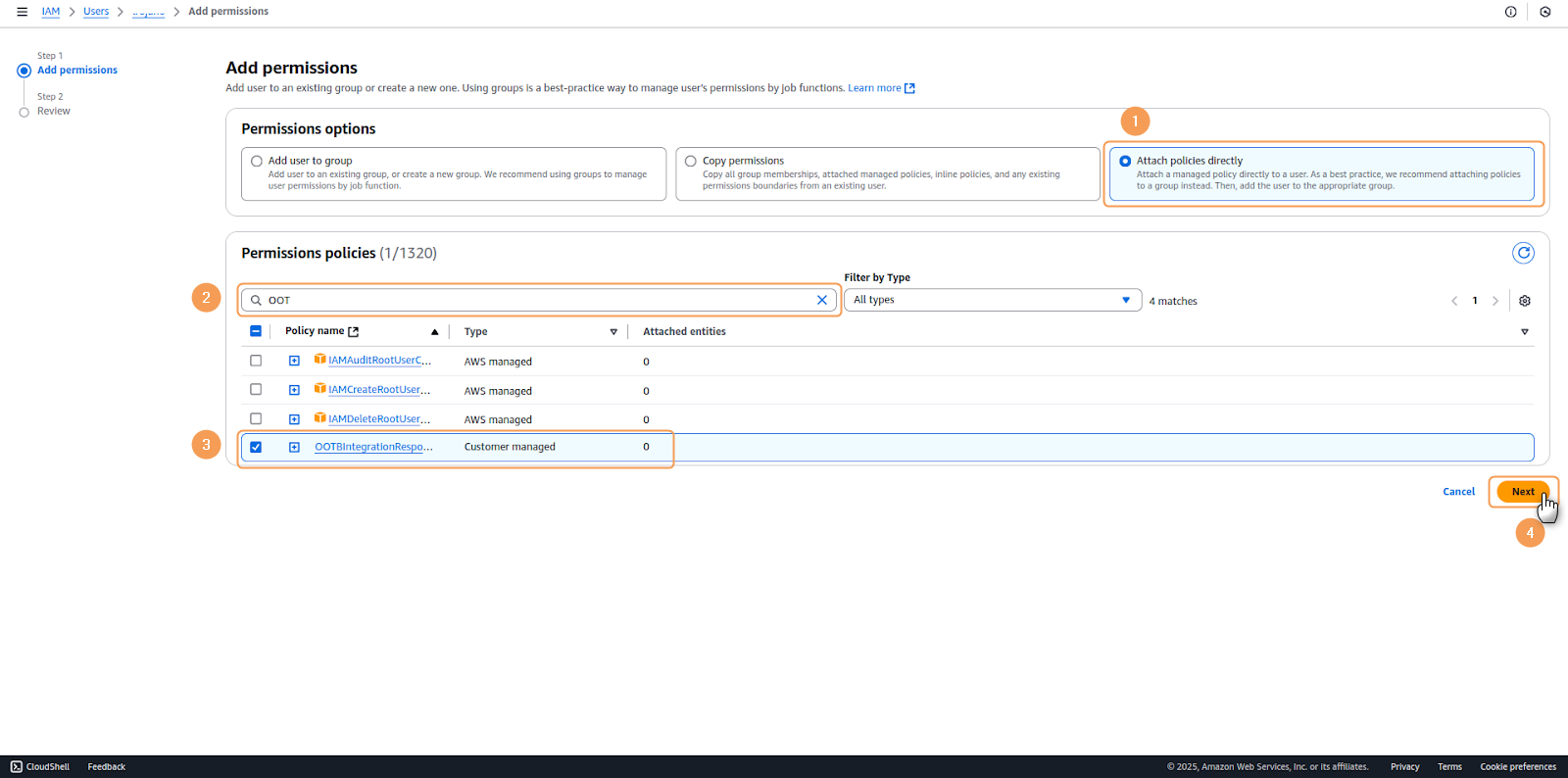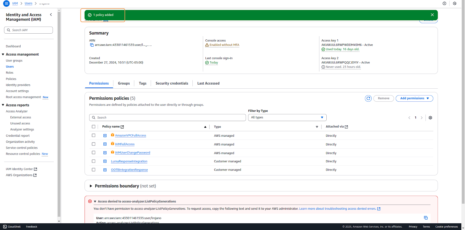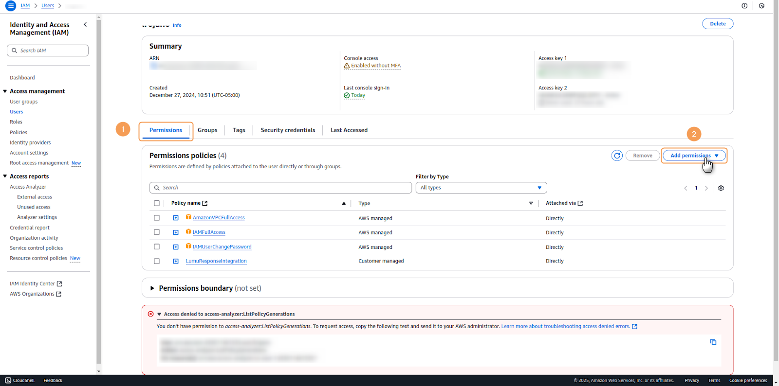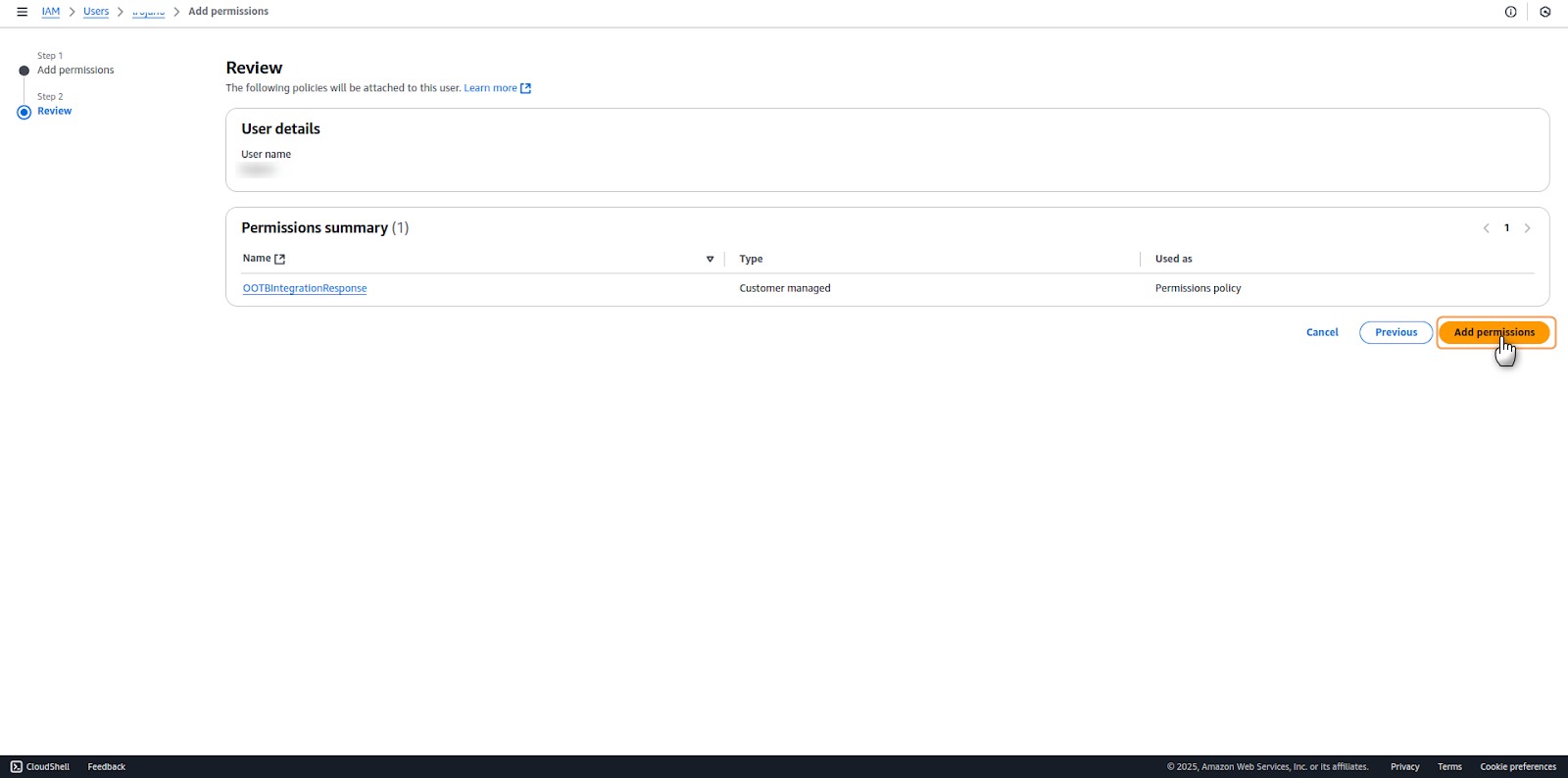 Lumu strongly recommends that the integration is handled by an exclusive user created for it. To learn how to create a new User in AWS, please refer to their documentation.1. Navigate to the Users section in the left navigation panel of the IAM dashboard. Locate and select the user account to which you wish to assign the policy.2. In the user's configuration window, locate the Permissions Policies tab. Select Add permission > Add permissions to begin the policy attachment process.3. In the Add Permissions interface, you'll find several Permission options. Select Attach policies directly as your chosen method. Utilize the search bar to locate your newly created policy by name. Once found, enable it by selecting the corresponding checkbox, then proceed by clicking Next.4. A review screen will present a summary of the selected permissions. Carefully verify the details, then select Add permissions to implement the changes.5. Once successfully completed, the system will display a confirmation message indicating that the policy has been successfully attached to the user.