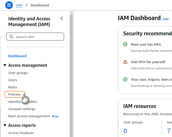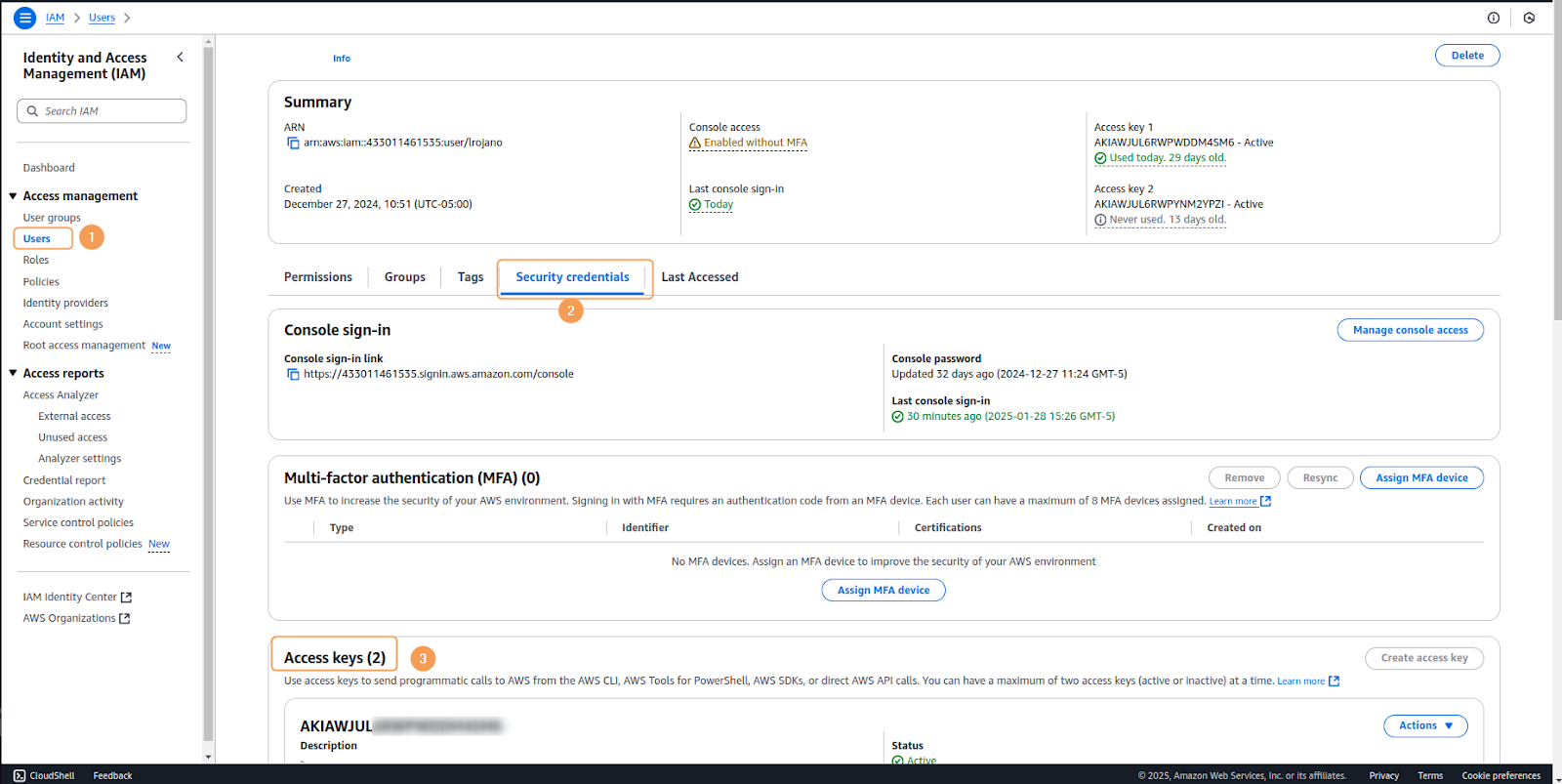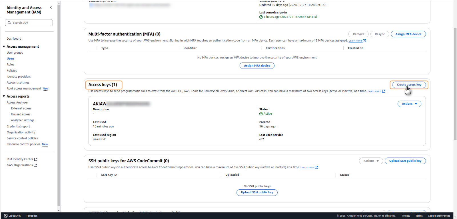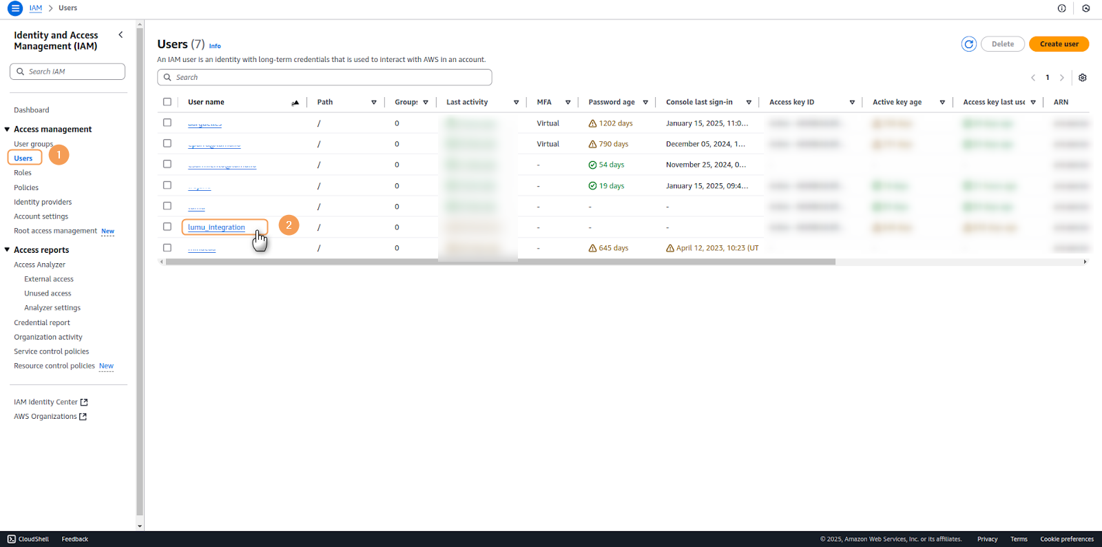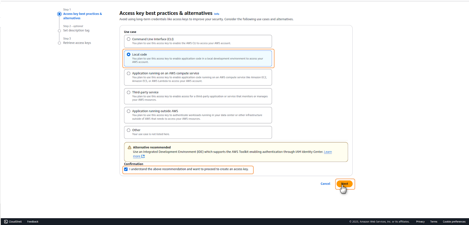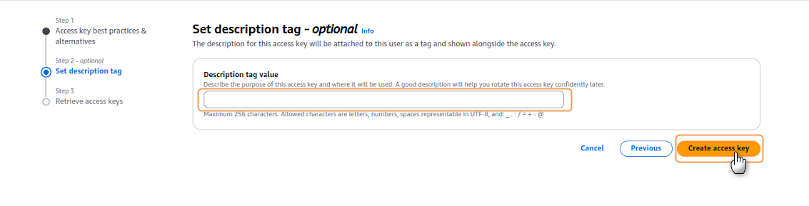 1. Navigate to the IAM service in your AWS Management Console and select Users from the left navigation panel. Click on the username for which you want to create access keys.2. Go to the Security credentials tab, locate the Access keys section and select Create access key.3. On the Access key best practices & alternatives page, select Local code. This option fits applications running outside AWS. Acknowledge the recommendations by checking the confirmation box. Once finished, click Next.4. Optionally, you may add a description tag to help identify the purpose of these access keys. This is recommended for better key management, especially in environments with multiple access keys. Whether you added a tag or not, click on Create access key to continue the process.5. On the final screen, a confirmation of creation message will appear, as well as your newly created credentials. Copy the following: