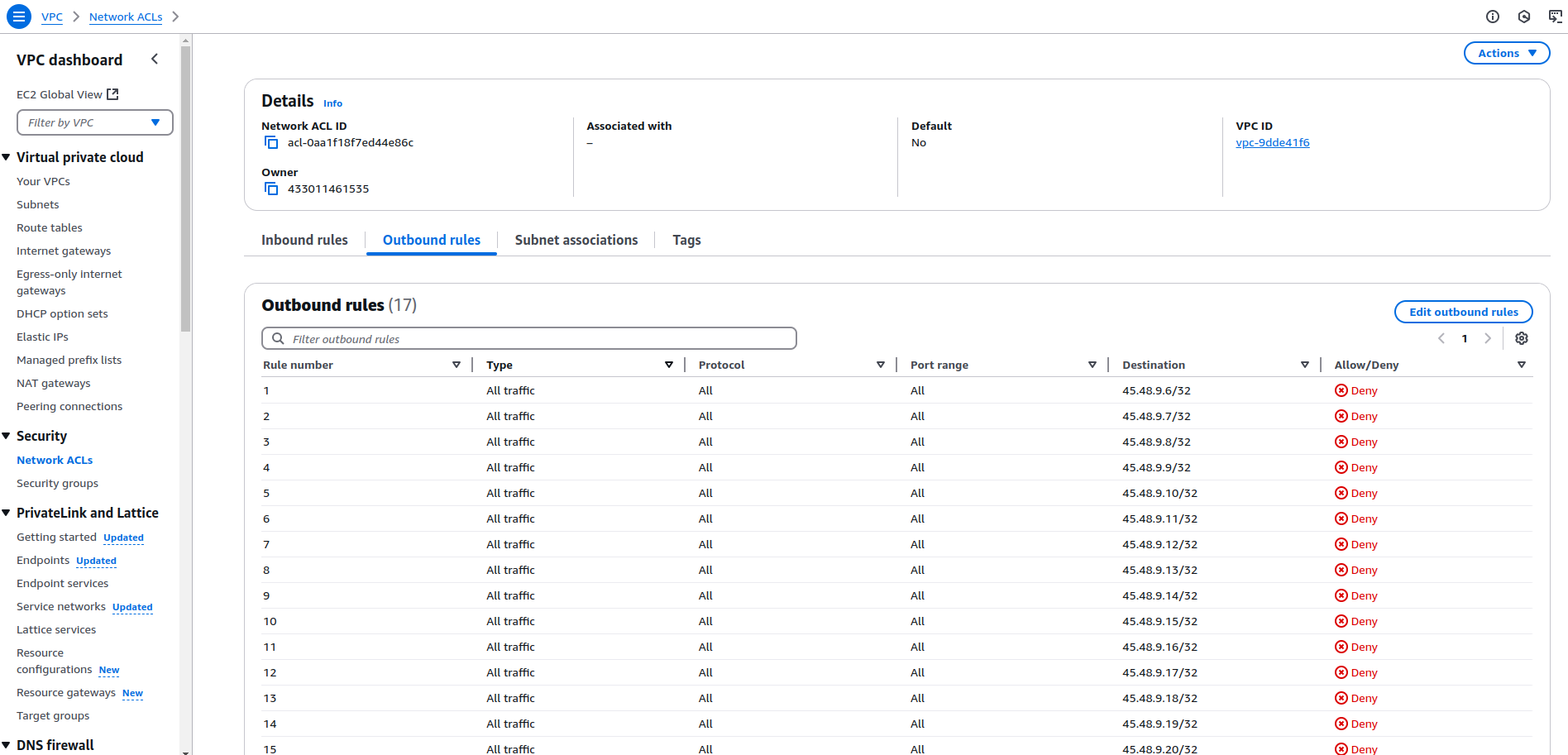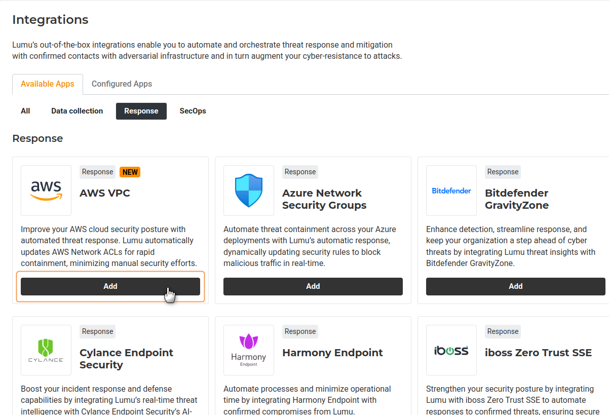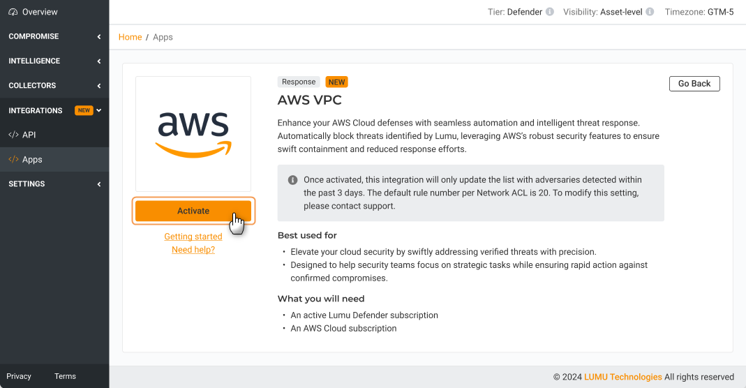 This article describes the required procedure to integrate AWS VPC with Lumu for automated response procedures. This is one of our featured Out-of-the-Box Response Integrations.