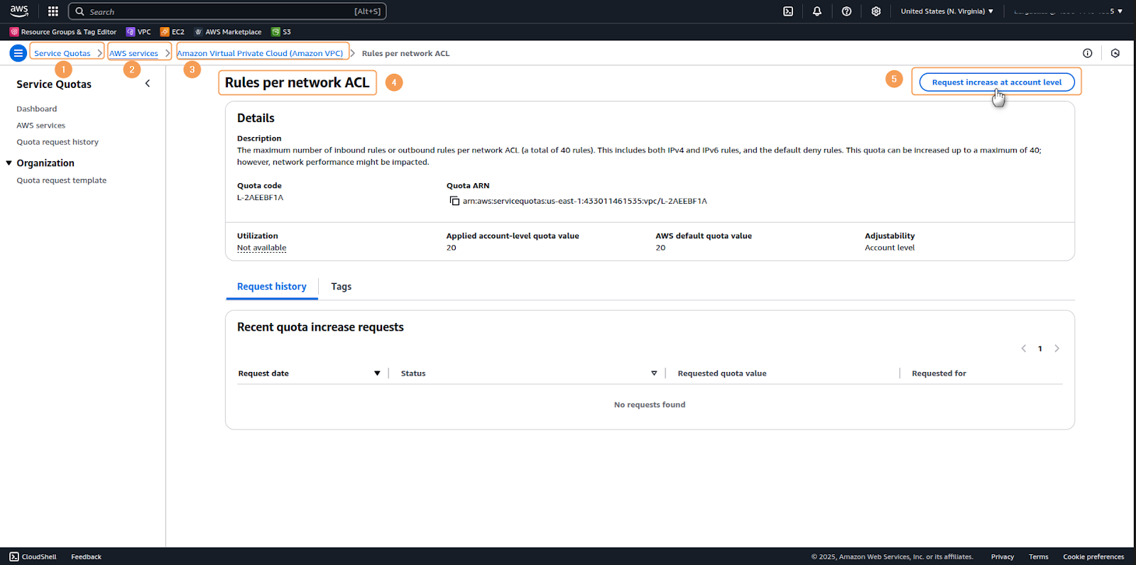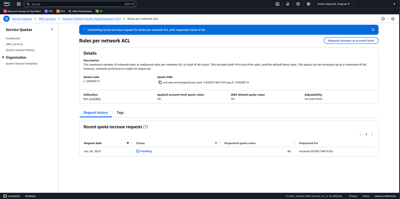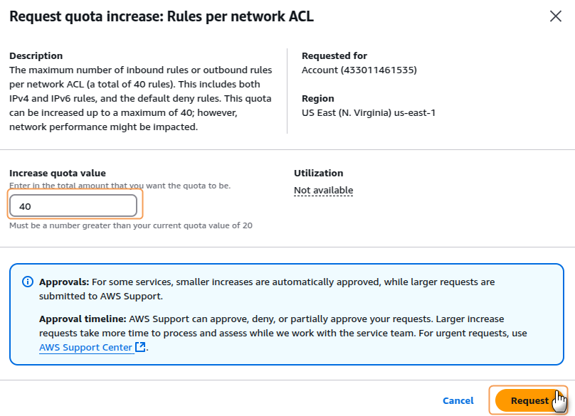 1. Go to Service Quotas > AWS Services > Amazon Virtual Private Cloud (Amazon VPC) > Rules per network ACL and click on Request increase at account level2. In the window that appears, enter in the Increase quota value textbox the number you want to increase to and click on Request.3. After completion, AWS will show a confirmation message of the request made.For detailed information about default Network ACL configurations and quota management, please refer to the AWS documentation.
