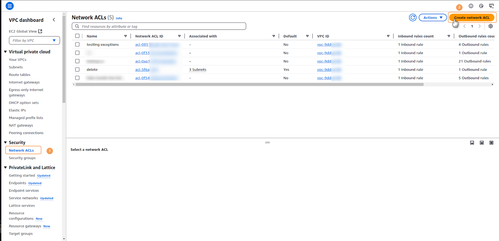1. Access the VPC Dashboard and in the left navigation pane, under the Security section, click on Network ACLs. In the corresponding panel, click on the orange Create Network ACLs