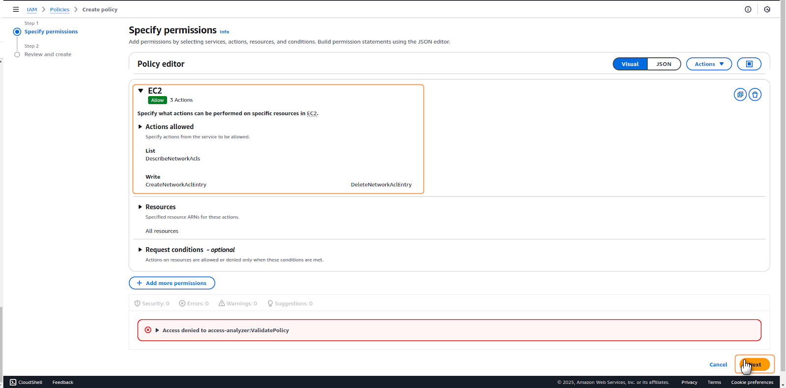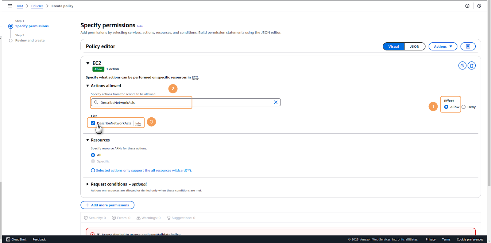 DescribeNetworkAcls CreateNetworkAclEntry DeleteNetworkAclEntryEnsure that the Effect setting is configured to Allow for these permissions.6. Once all permissions have been selected, verify that the Action Allowed section matches the expected configuration when collapsed. After confirmation, click Next